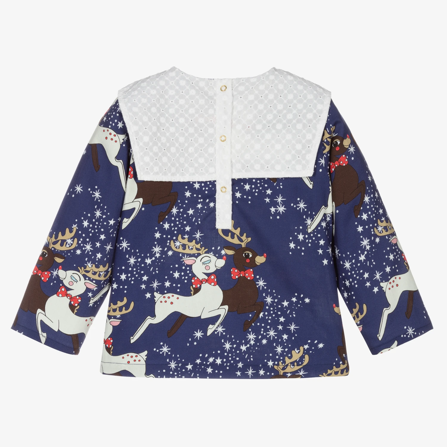 Girls blue Christmas blouse from Mini Rodini, made in soft organic cotton twill. It has a colourful reindeer pattern and back popper fastening. The white broderie anglaise sailor-style collar is made in soft organic cotton.