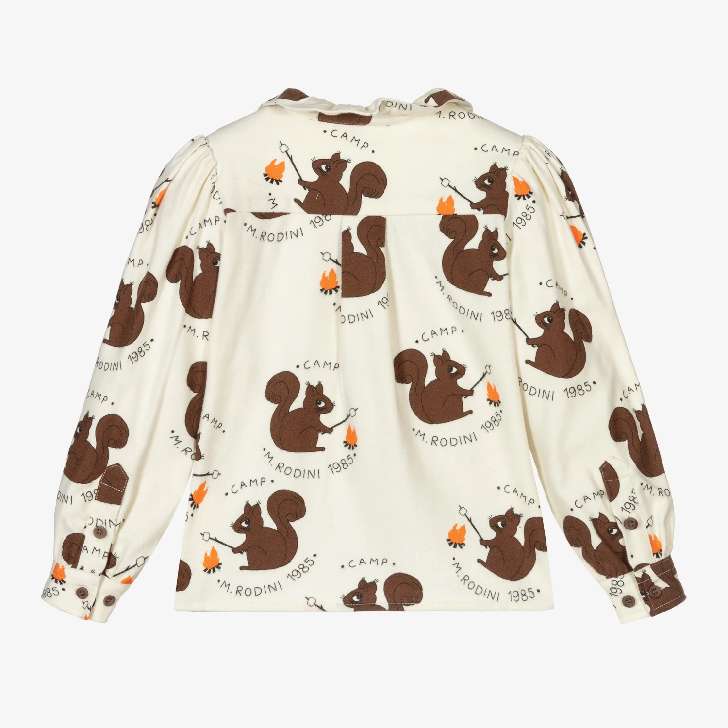Ivory flannel shirt for girls, by Mini Rodini. Made in soft organic cotton flannel, it has a brown camping squirrel pattern with the brand’s logo printed all-over, and a pretty high neck ruffle collar.