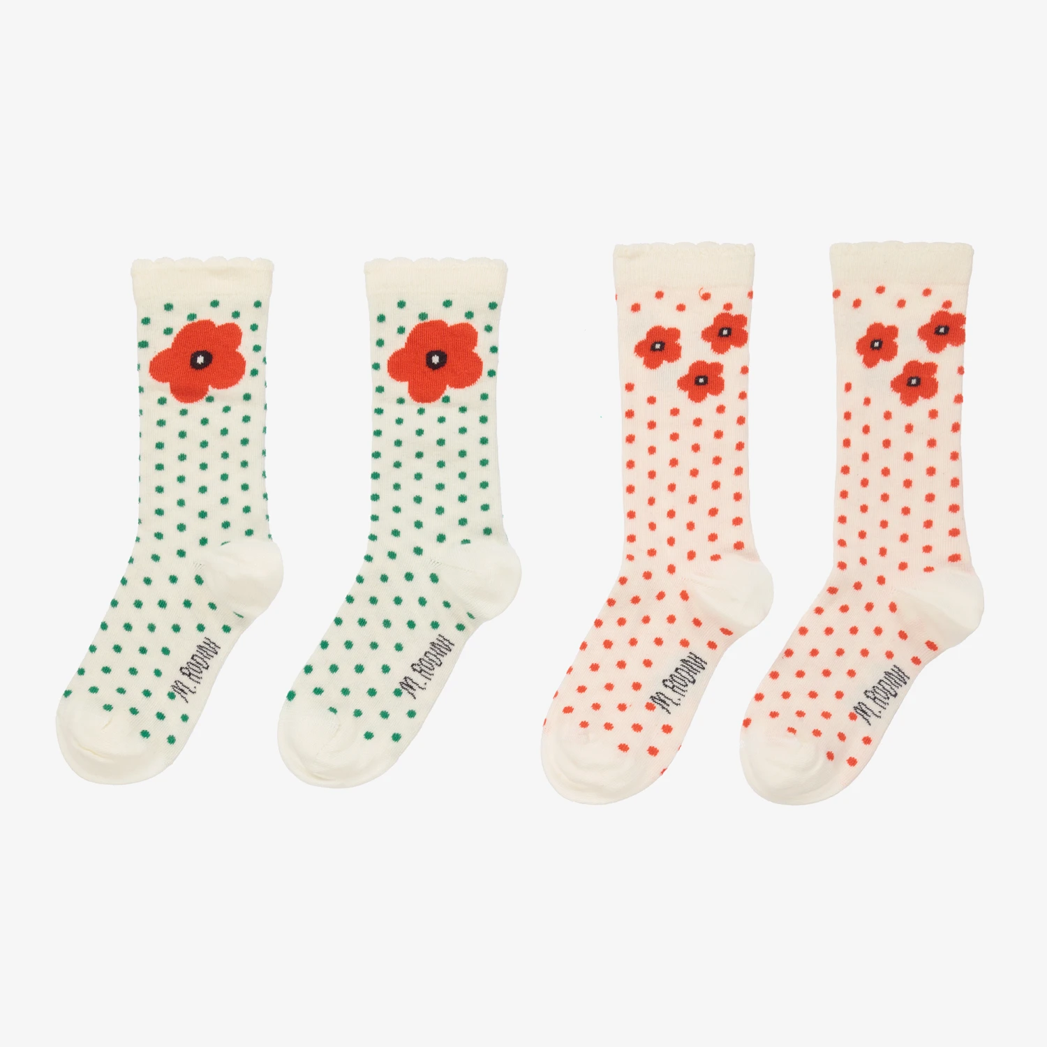 Two pairs of ivory organic cotton socks for girls by Mini Rodini. With lovely red flower motifs on both, one pair has a green polka dot pattern and the other pair has red polka dots. Super soft and stretchy, they have pretty scalloped details around the cuffs and black jacquard logos on the soles.