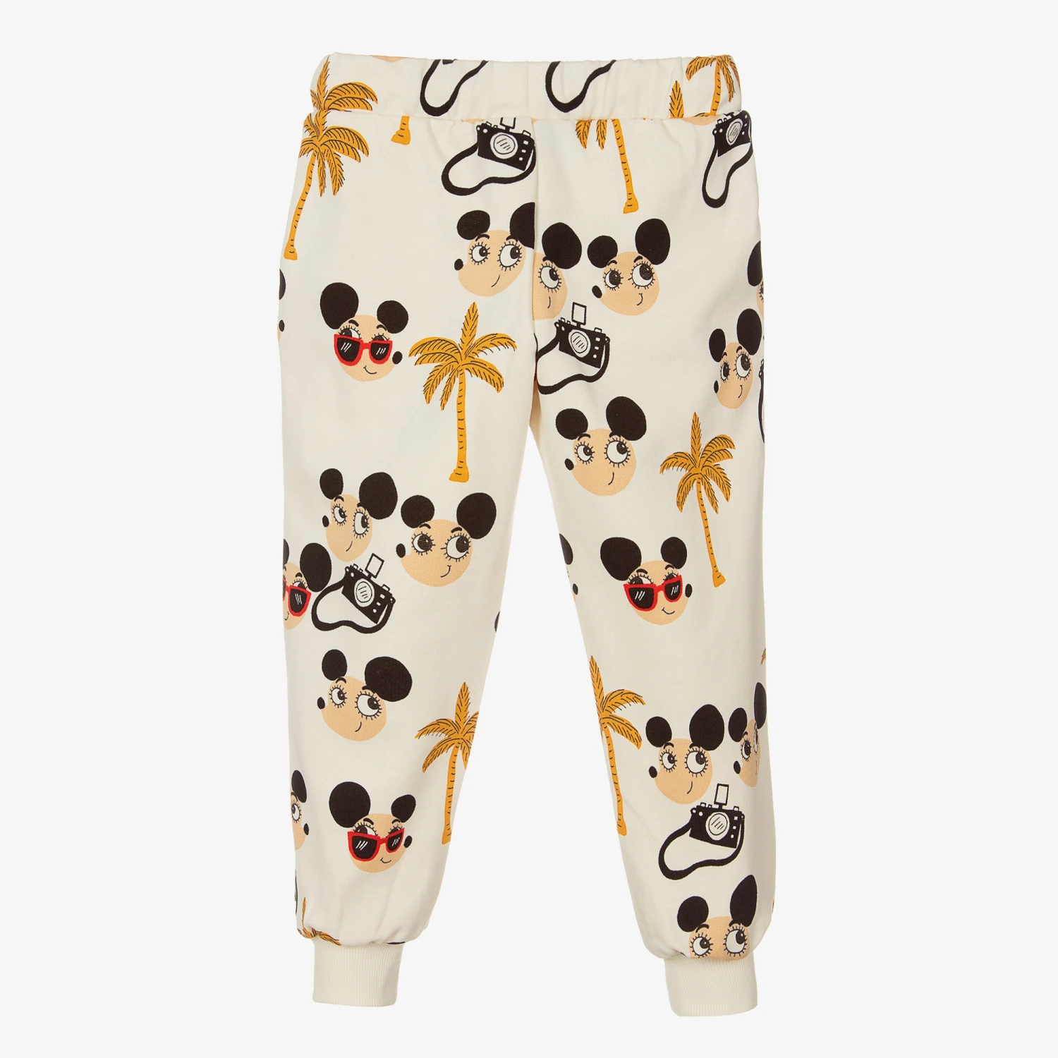 Ivory joggers for boys and girls by Swedish brand Mini Rodini, made from soft organic cotton jersey. These casual joggers have a fun pattern, featuring the brand’s Ritzratz characters, cameras and palm trees in beige and black. A comfortable, easy-to-wear style, they have an elasticated waist with drawstring ties for a good fit, and useful front pockets.