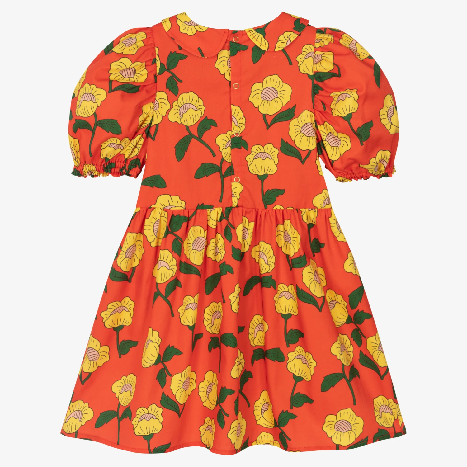 Red-orange dress for girls from Mini Rodini. Woven in soft and lightweight organic cotton twill, this vibrant dress is decorated with cool cartoon-style flower artwork in yellow, green and pink. It has easy-dressing popper fastenings with gold hardware details on the back, a sweet rounded collar and pretty puff sleeves with elasticated cuffs for comfortable wear.