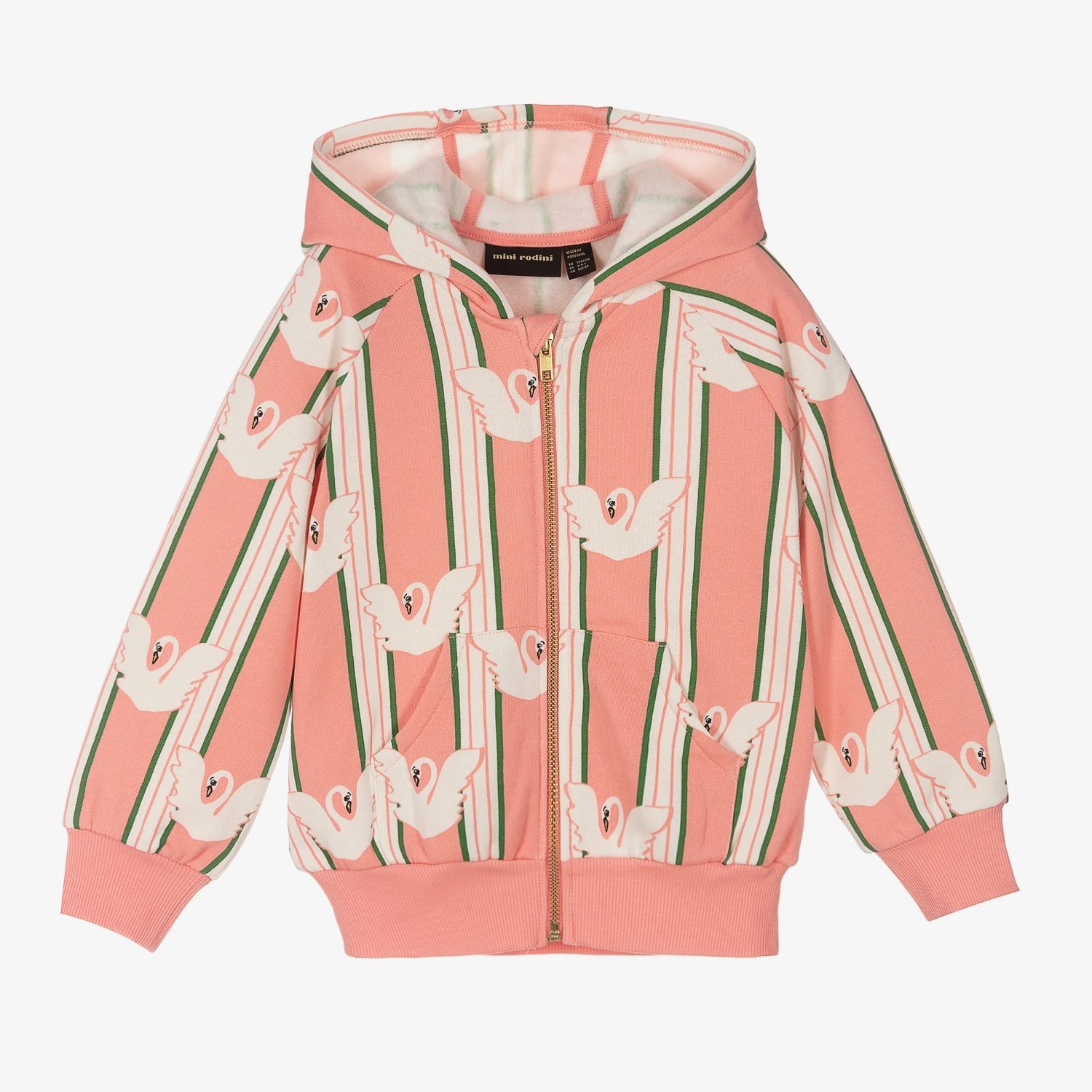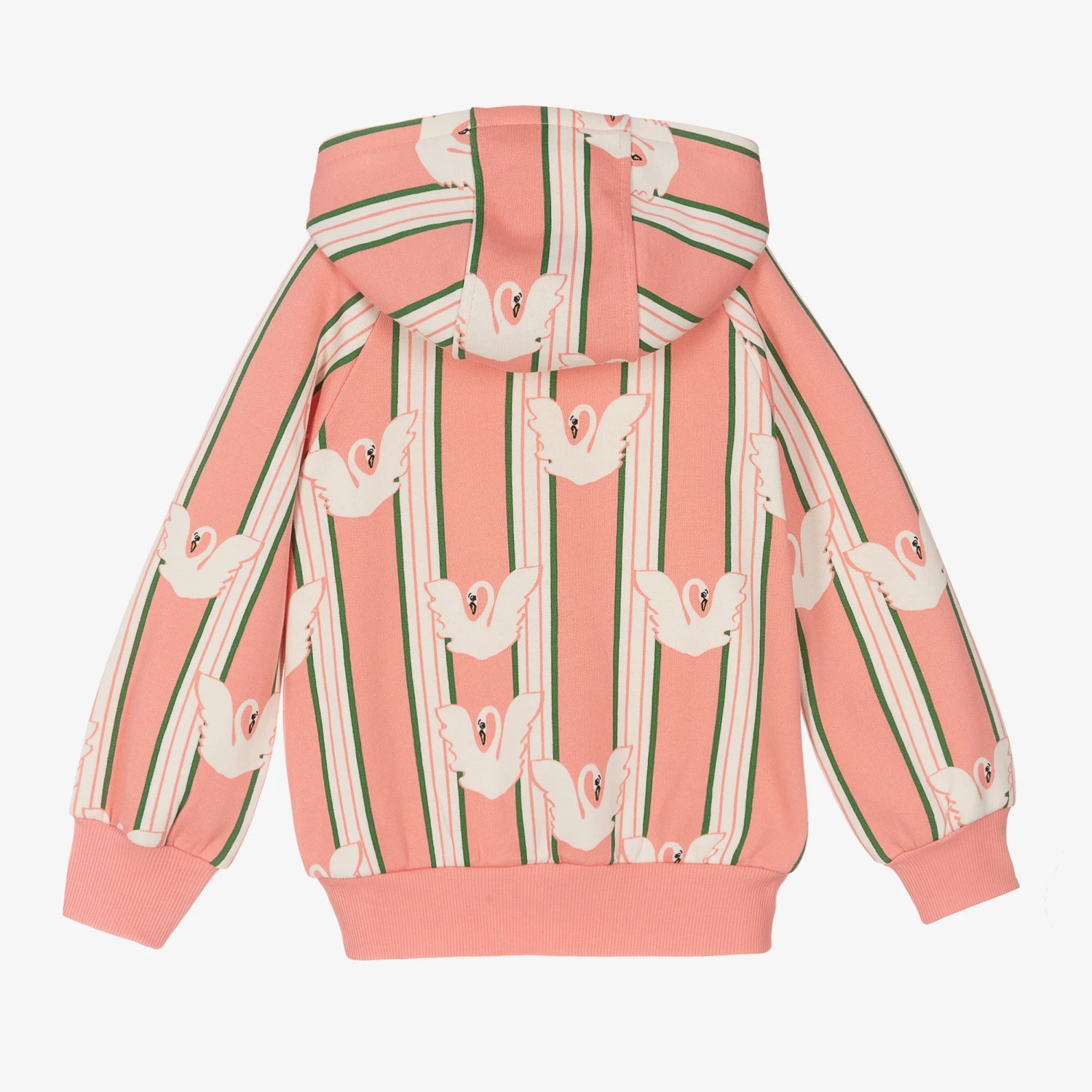 From Mini Rodini, a pink, white and green striped zip-up hooded top for girls, with a lovely white swan pattern. Made in organic cotton sweatshirt jersey, with a fleecy feel inside, it has soft ribbed trims and pouch pockets on the front.