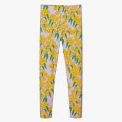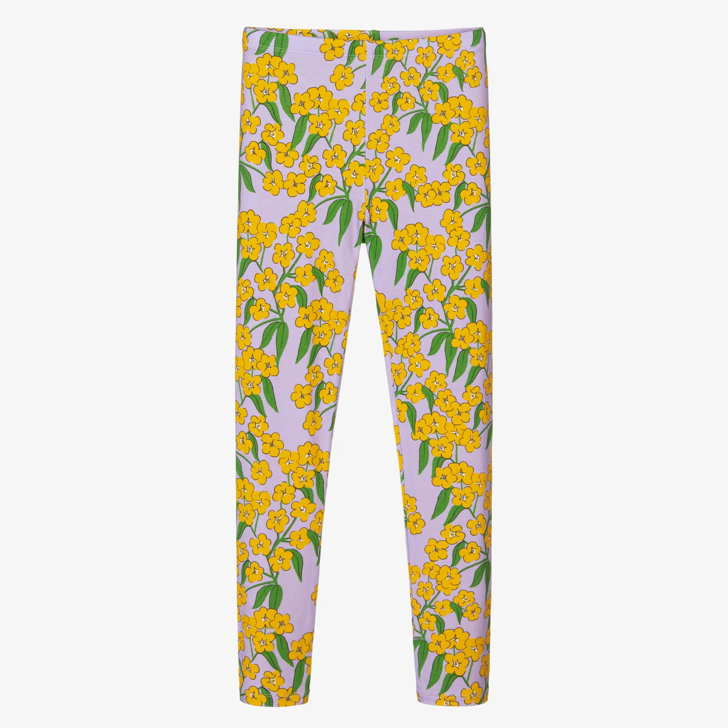 Cute lilac purple leggings for girls, by Mini Rodini. Made in soft eco-friendly lyocell jersey, they have a bright yellow and green Alpine Flowers pattern, and are super stretchy for a comfortable fit.