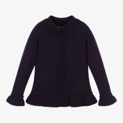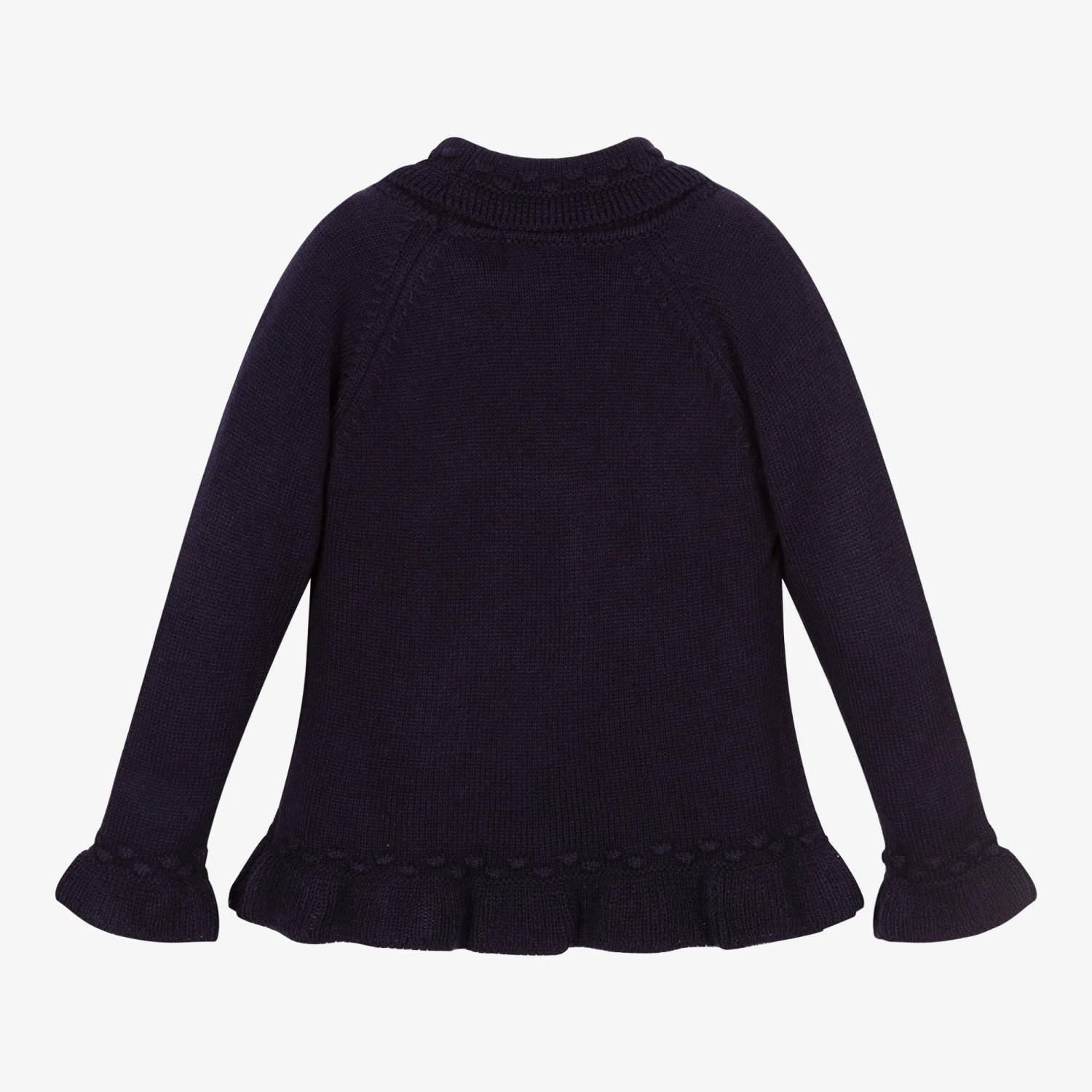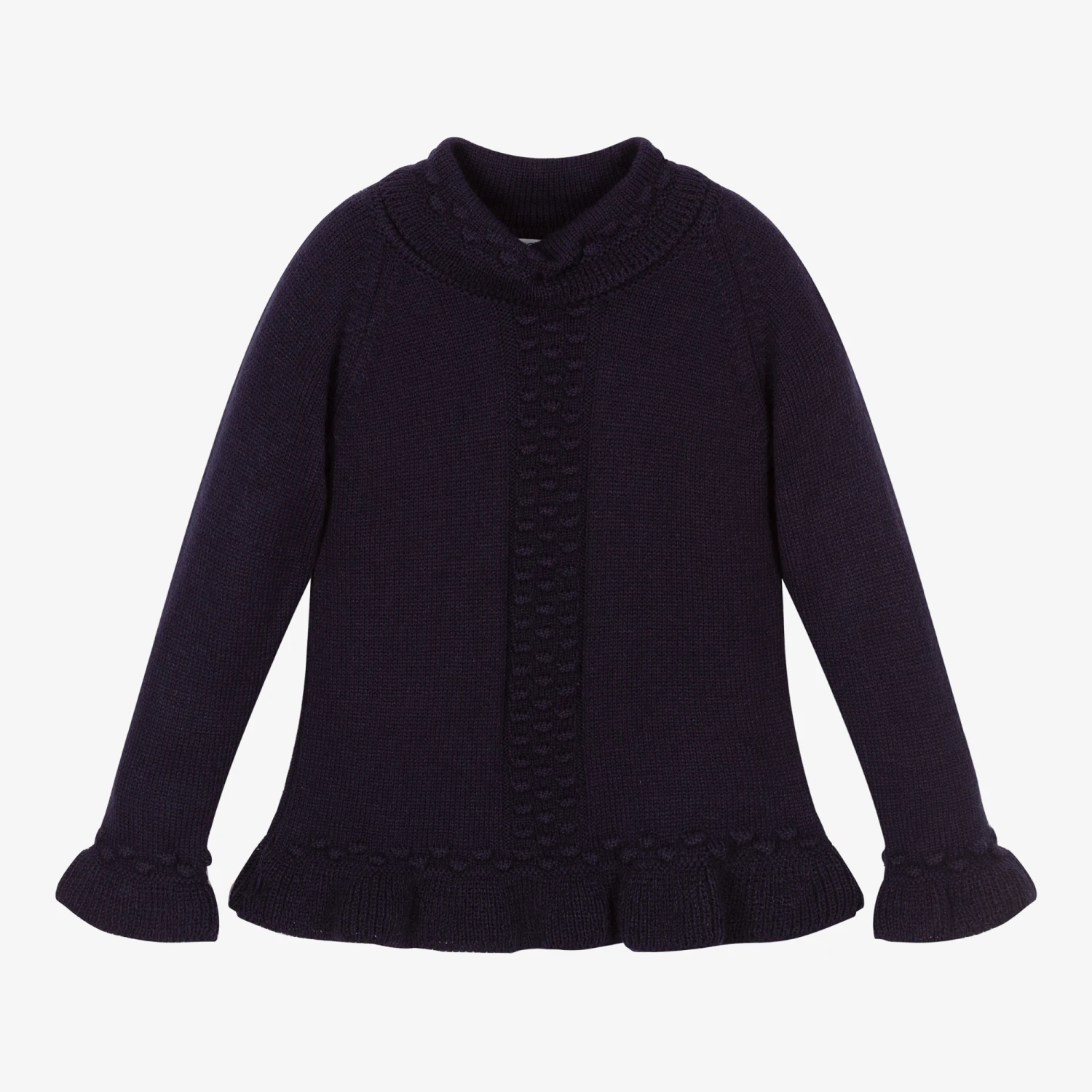Navy blue roll neck sweater for girls by Miranda, knitted in lightweight acrylic. It has a pretty, raised dot pattern around the roll neck, down the front, around the hemline and on the cuffs. The collar, cuffs and hemline also have a feminine frilled edge.