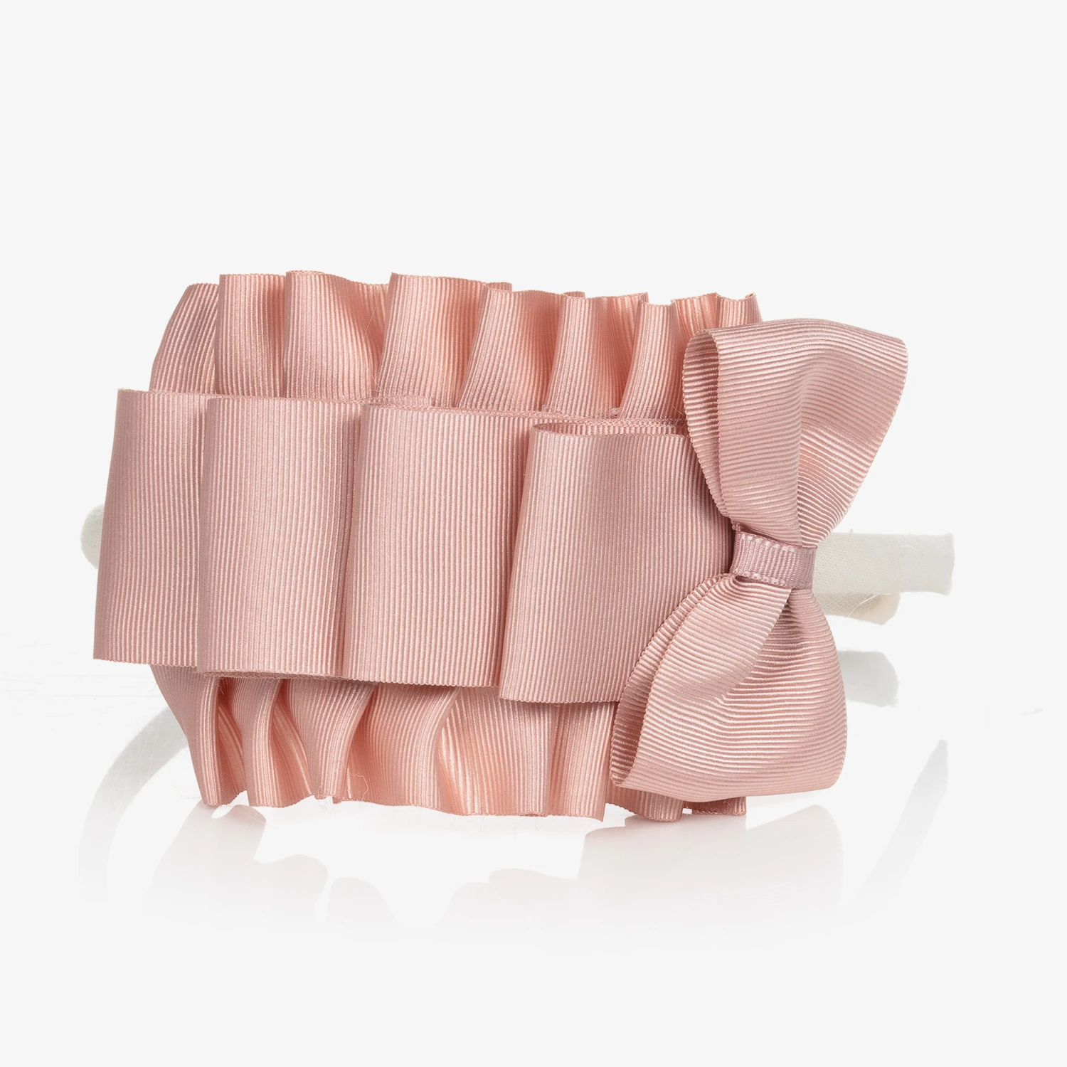 Pink and ivory hairband for girls by Spanish brand, Miranda. This classic hair accessory has a fabric-covered band and is decorated across the top with pleated grosgrain ribbon, with a small bow rosette for a pretty finish.