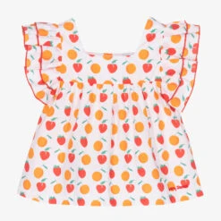 Exclusive to Childrensalon, a lovely white blouse for girls by Mitty James, with a red and orange fruit print. Made in soft, comfortable cotton poplin, it has pretty, tiered, ruffled sleeves and fastens with buttons around the back.