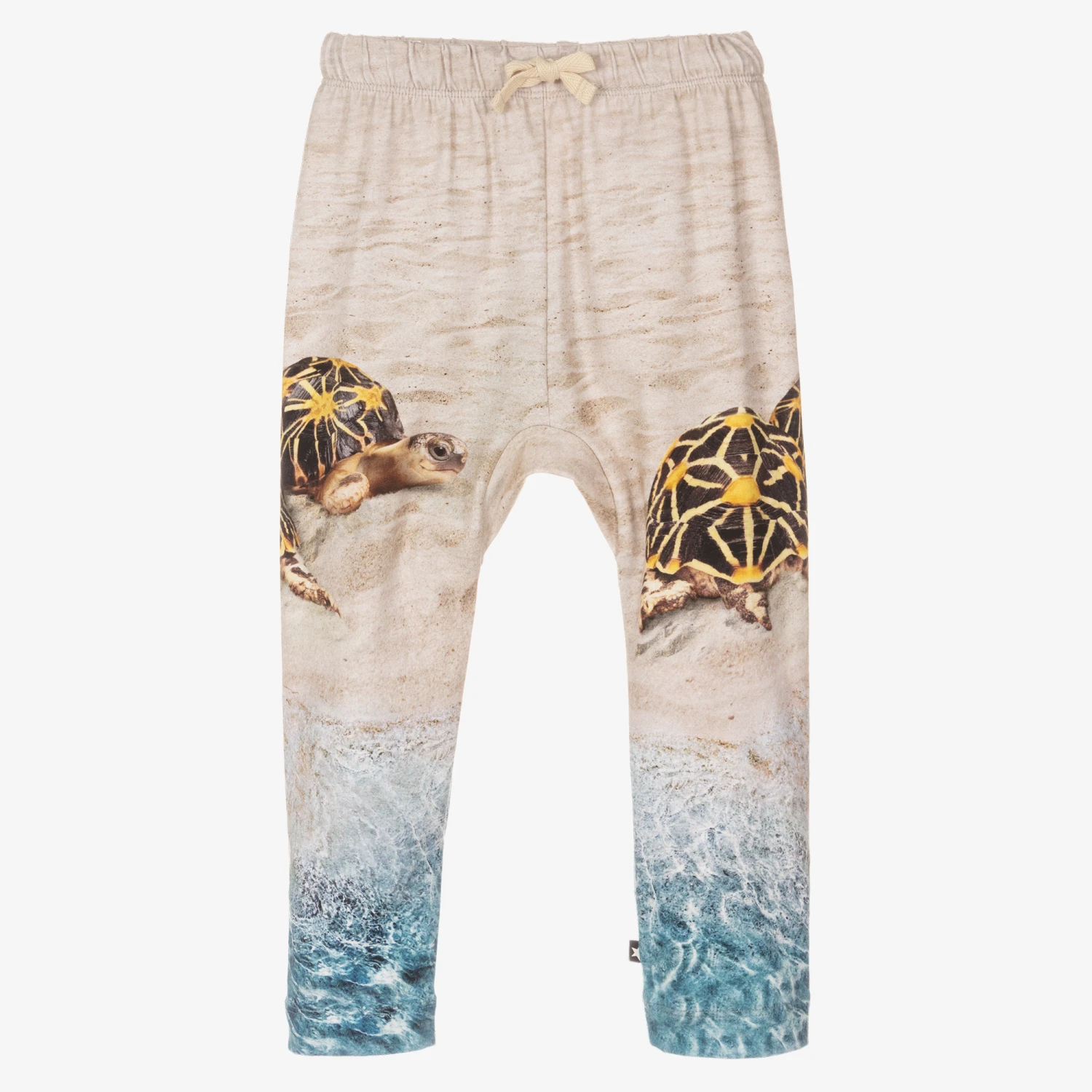 Beige organic cotton leggings for little boys and girls by Danish brand Molo, with a turtles on the beach print. Made in comfortable jersey, they have a drawstring waist for a good fit.