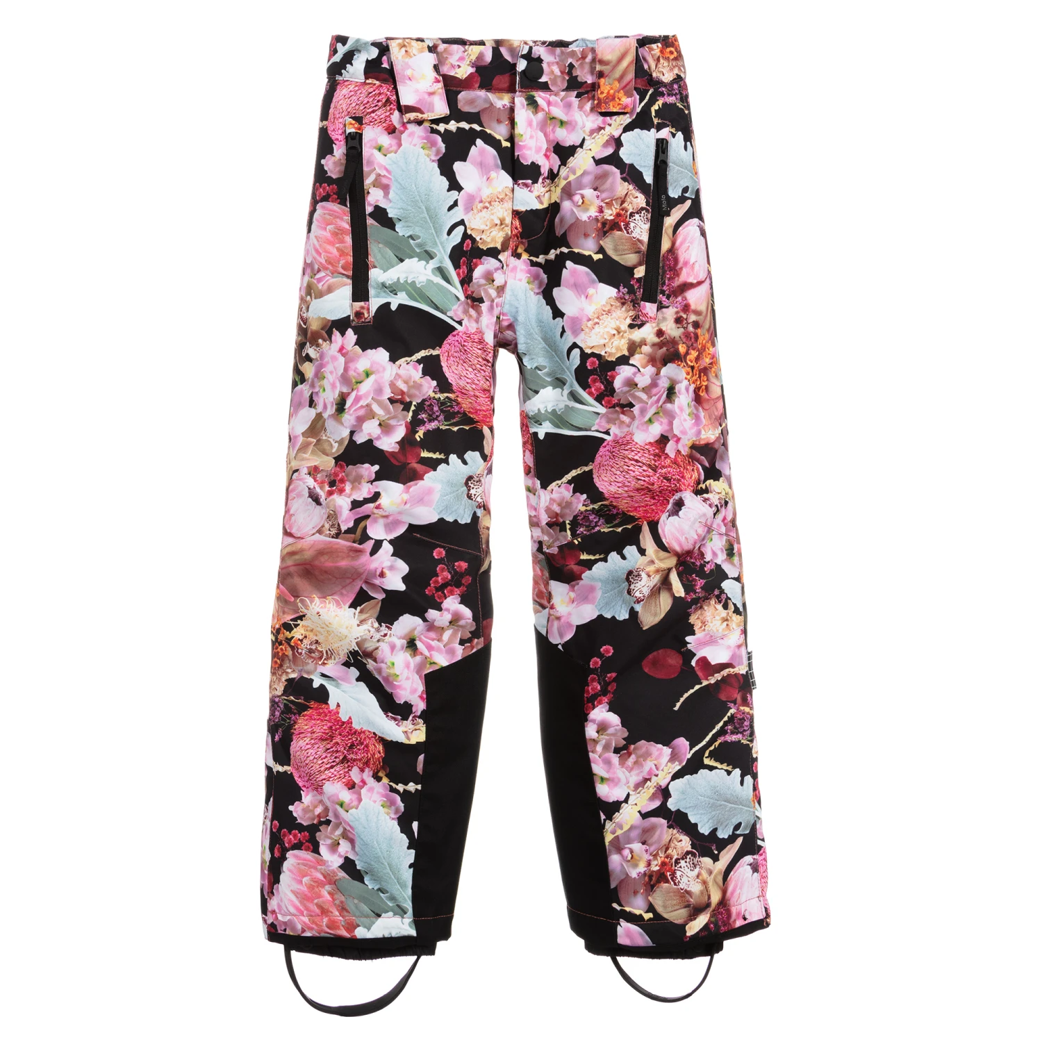 Girls black ski salopettes by Danish brand Molo, with pink, purple and green floral print. Waterproof, windproof and breathable, they are lined in soft fleece and have 3M Thinsulateâ„¢ insulation for superior warmth. They have removable gaiters and adjustable leg openings, with a useful adjustable waistband.