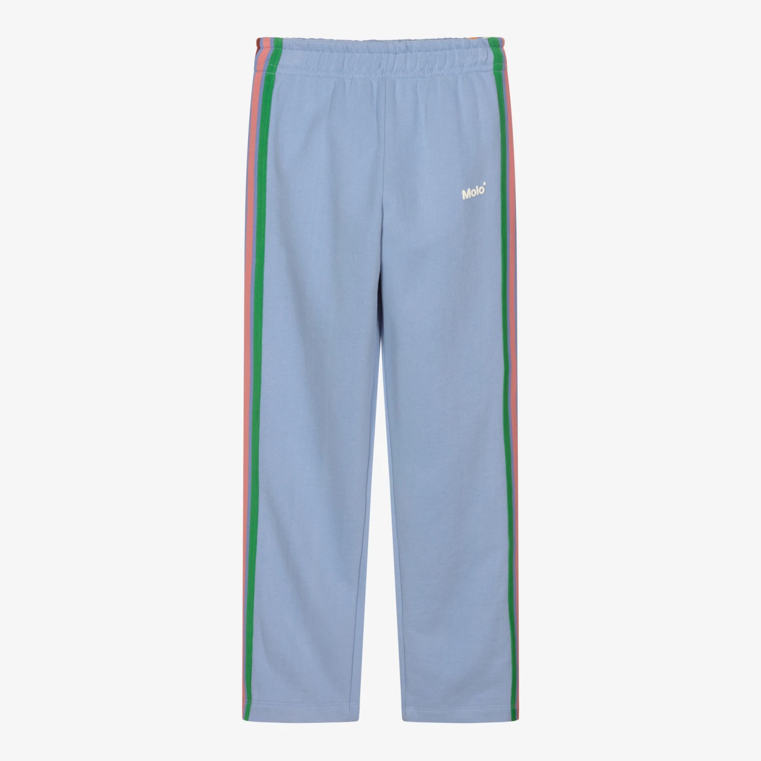 Girls soft cornflower blue joggers by Molo, made in soft organic cotton jersey with a fleece inside. They have a white rubberised logo on the front and colourful stripes down the sides. The waistband is elasticated for a comfortable fit.