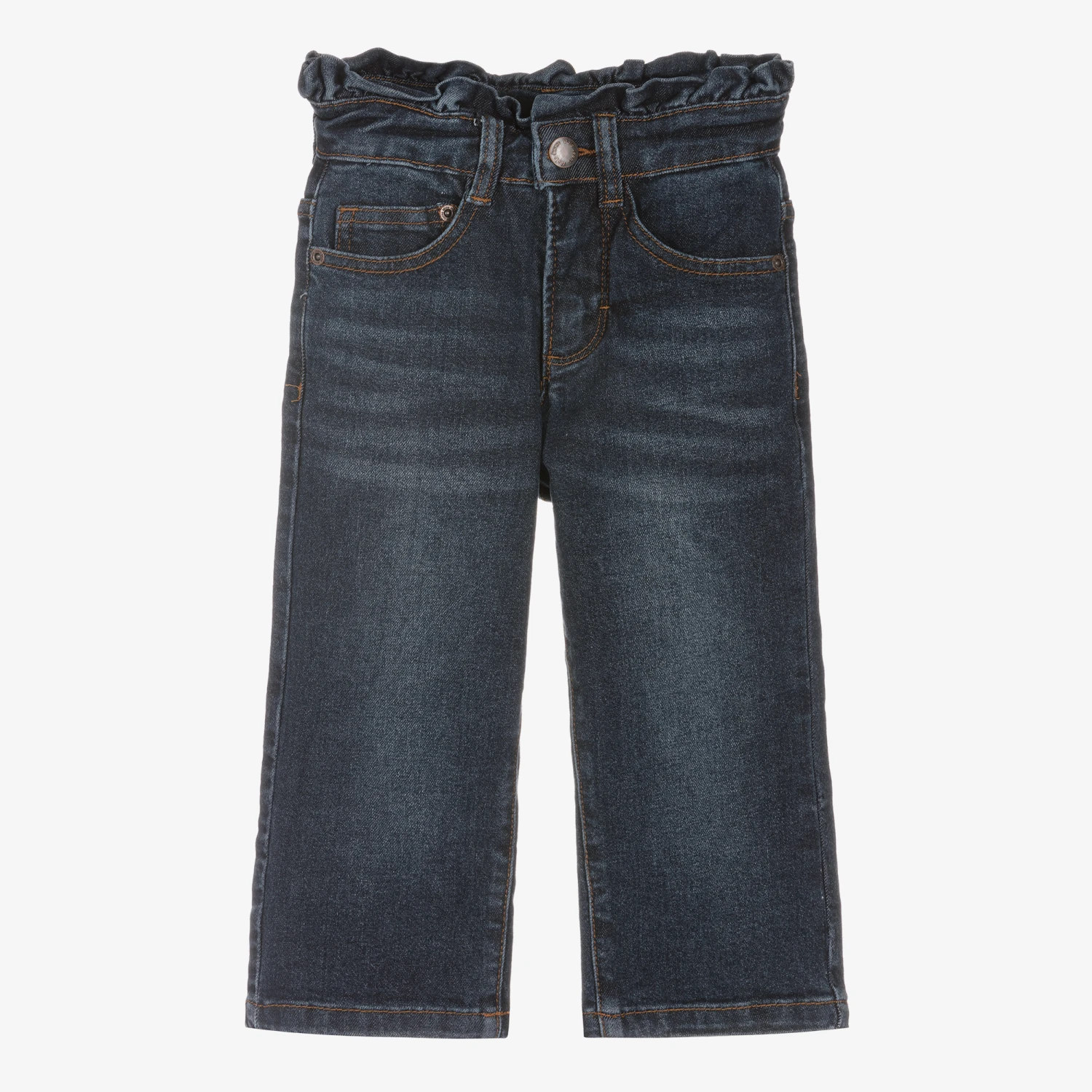 Blue relaxed fit denim jeans for girls by Danish brand Molo, with a washed and worn look. Made in a comfortable, stretchy organic cotton and recycled Repreve® polyester blend, they are just right for relaxing all-day wear. The frilled waistband is adjustable for a good fit and has a logo badge around the back. They fasten with a logo popper and a zip on the front.