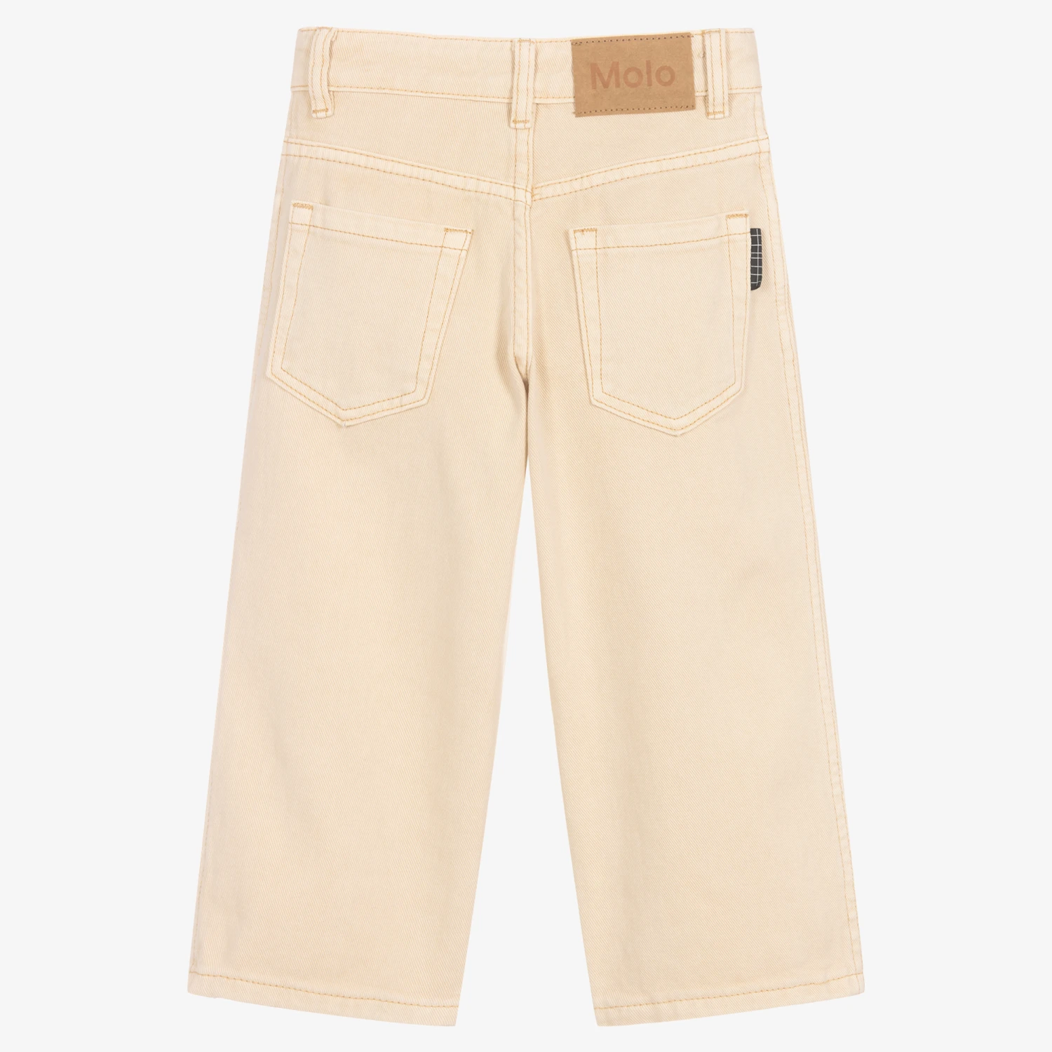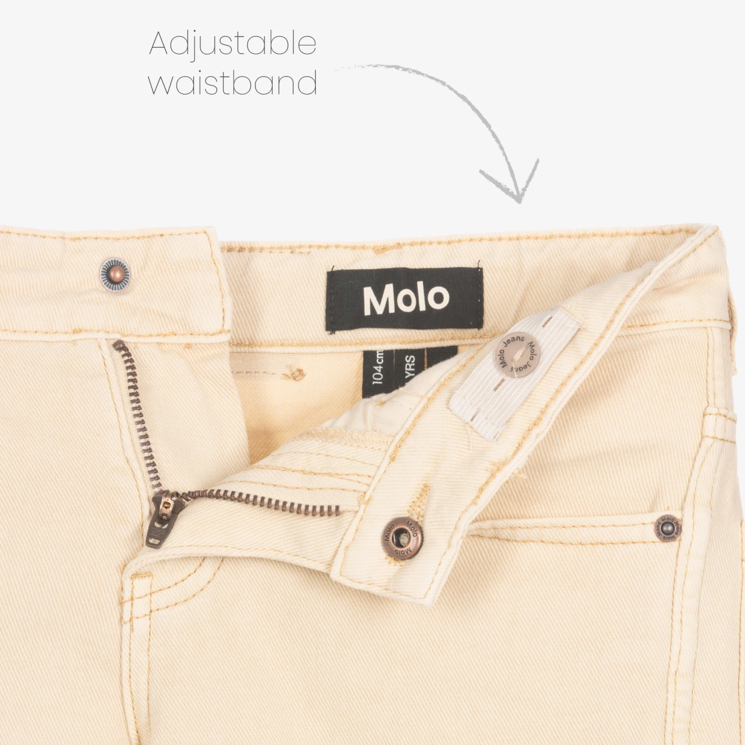 Light beige jeans for girls by Danish brand Molo, made in soft and durable organic cotton denim. Easy-to-wear and style, they have five-pocket styling, with a zip and popper closure. They come in a relaxed straight fit, featuring a logo patch and tab on the back for added coolness. There is an adjustable waistband on all sizes.