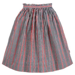 A lovely navy blue, red and white check skirt for girls by Molo, made in a soft and lightweight polyester. It has a gathered, elasticated waist, with sweet ruffles and a zip on the side.
