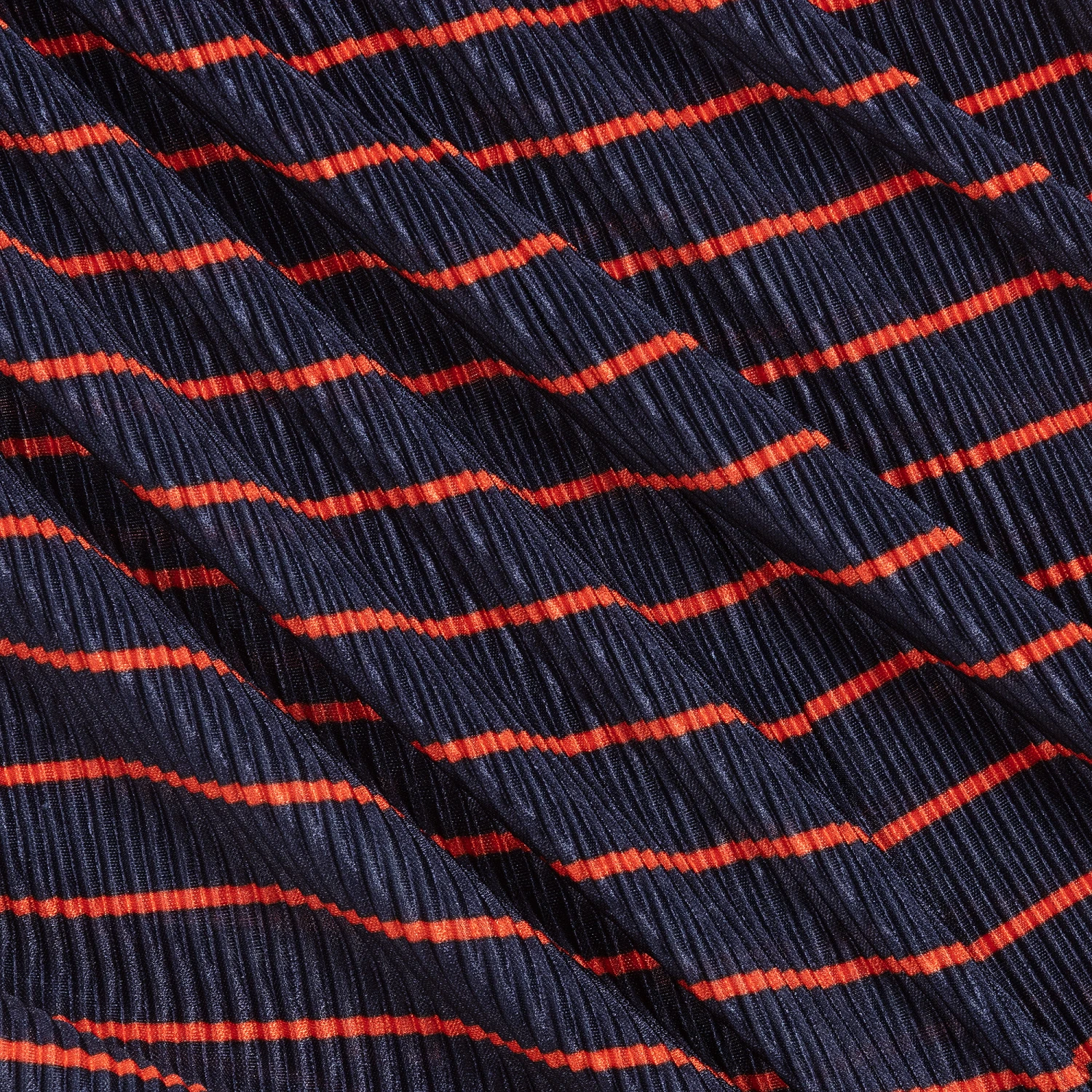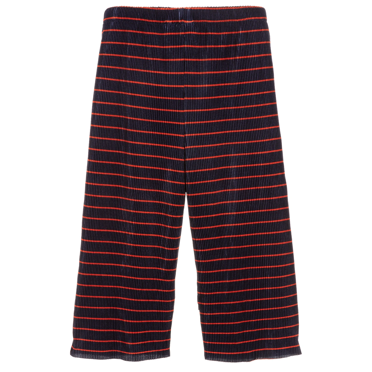 Girls navy blue and red striped culottes from Molo, made in silky-feel pleated satin, with an elasticated waistband.Â