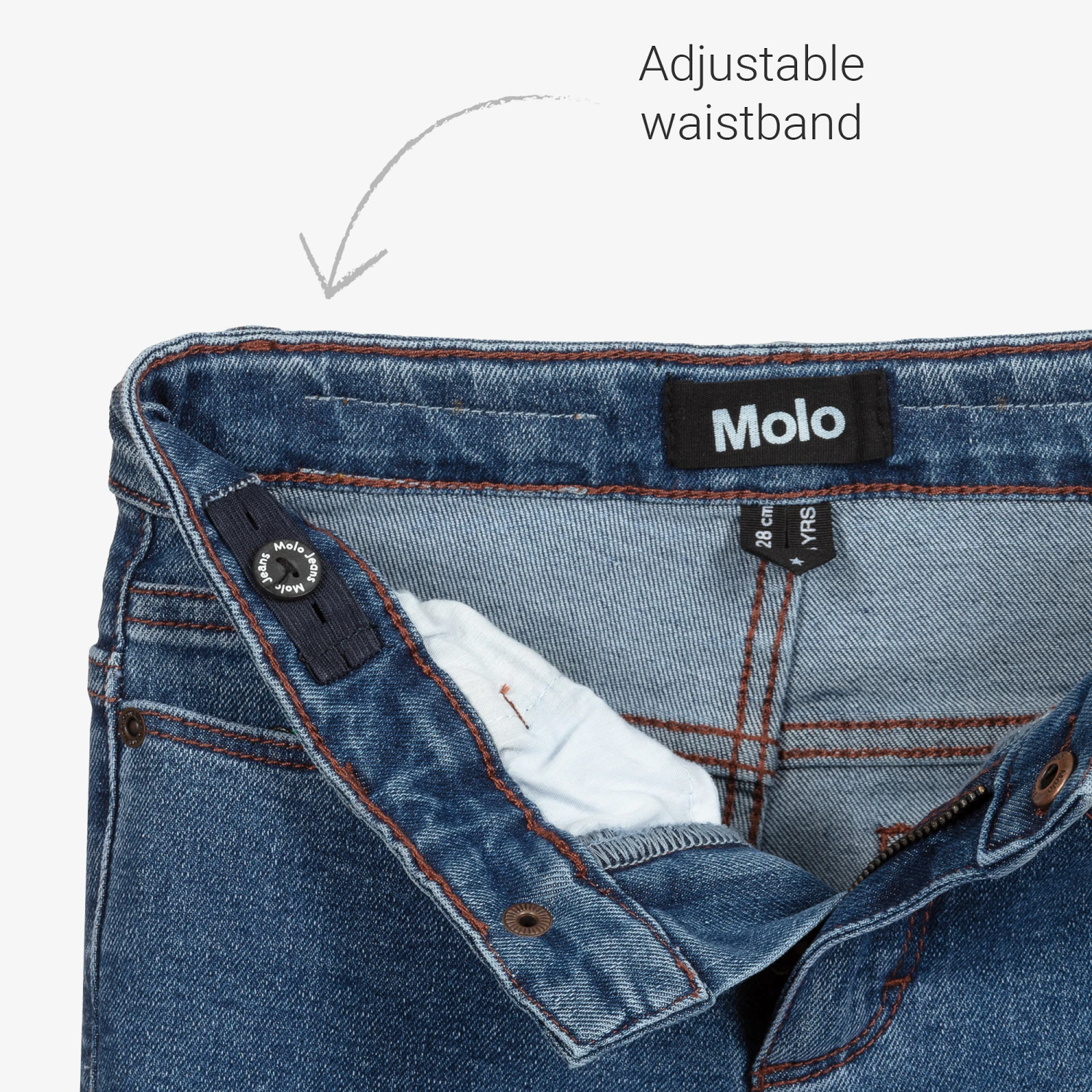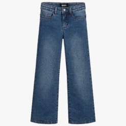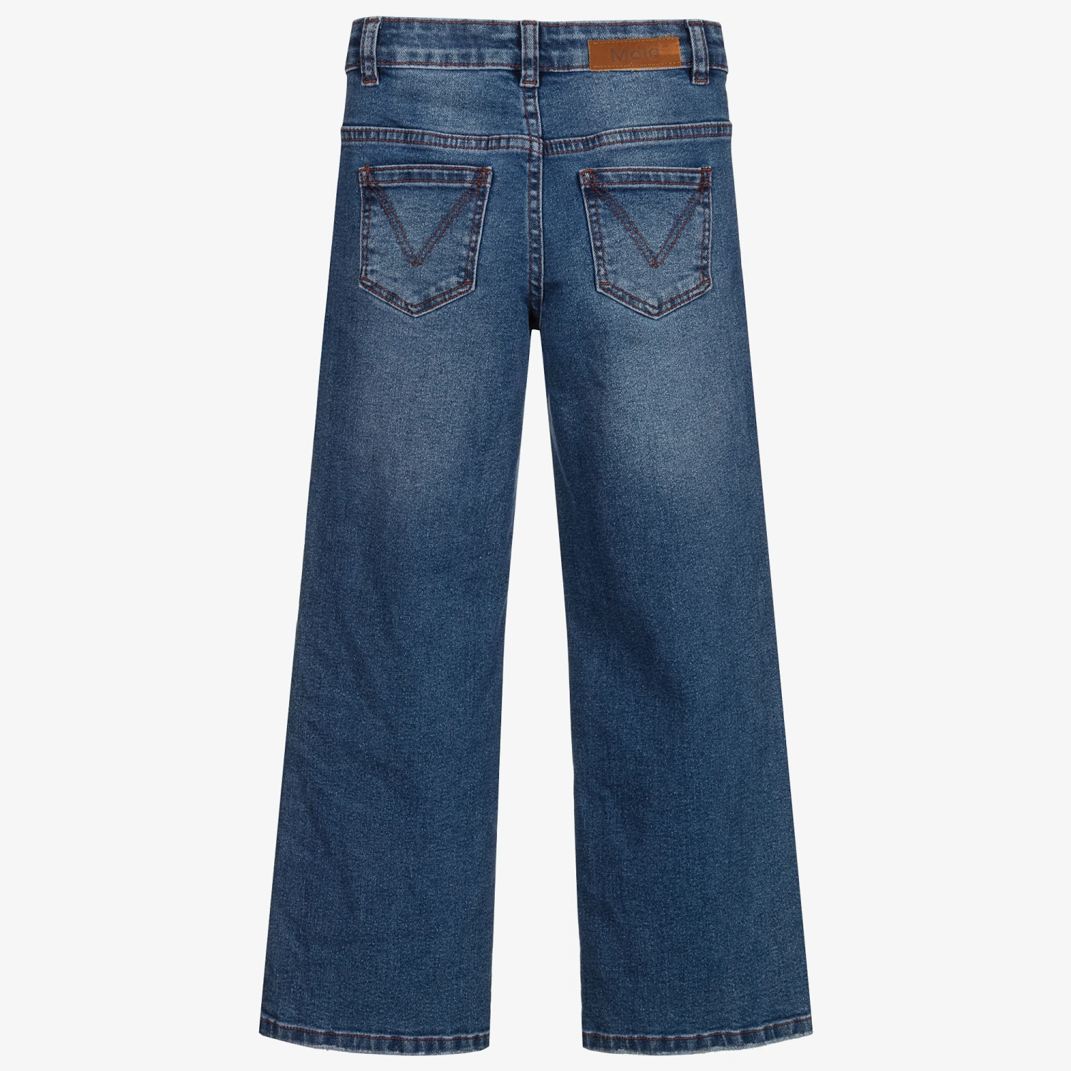 Wide leg jeans for girls, by Molo. Made from a blend of organic cotton and Repreve® recycled plastic bottles, they have traditional five-pocket styling with brown stitching.