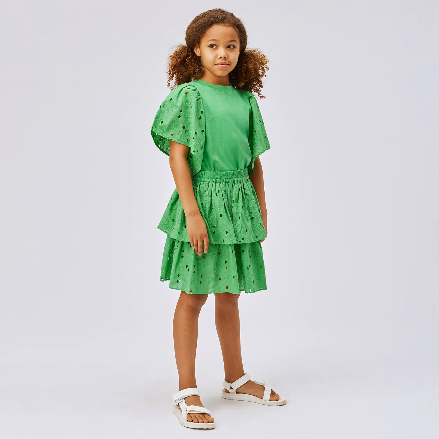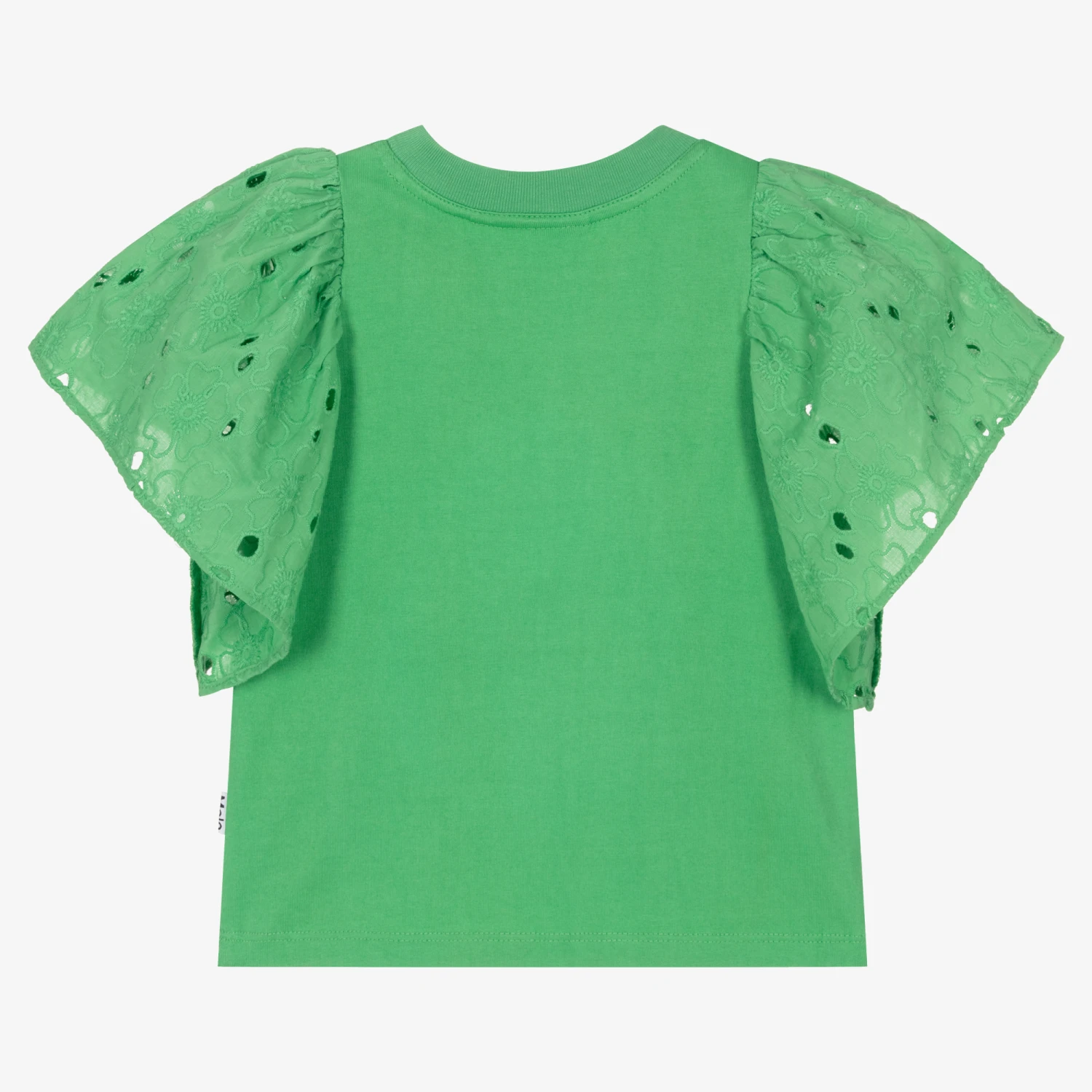 Pretty green T-shirt for girls by Danish brand Molo, made in soft cotton jersey. This easy-to-wear tee has gorgeous broderie anglaise flutter sleeves for a lovely look. It has a casual crew neckline and monochrome logo tab on the side seam for a branded finishing touch.