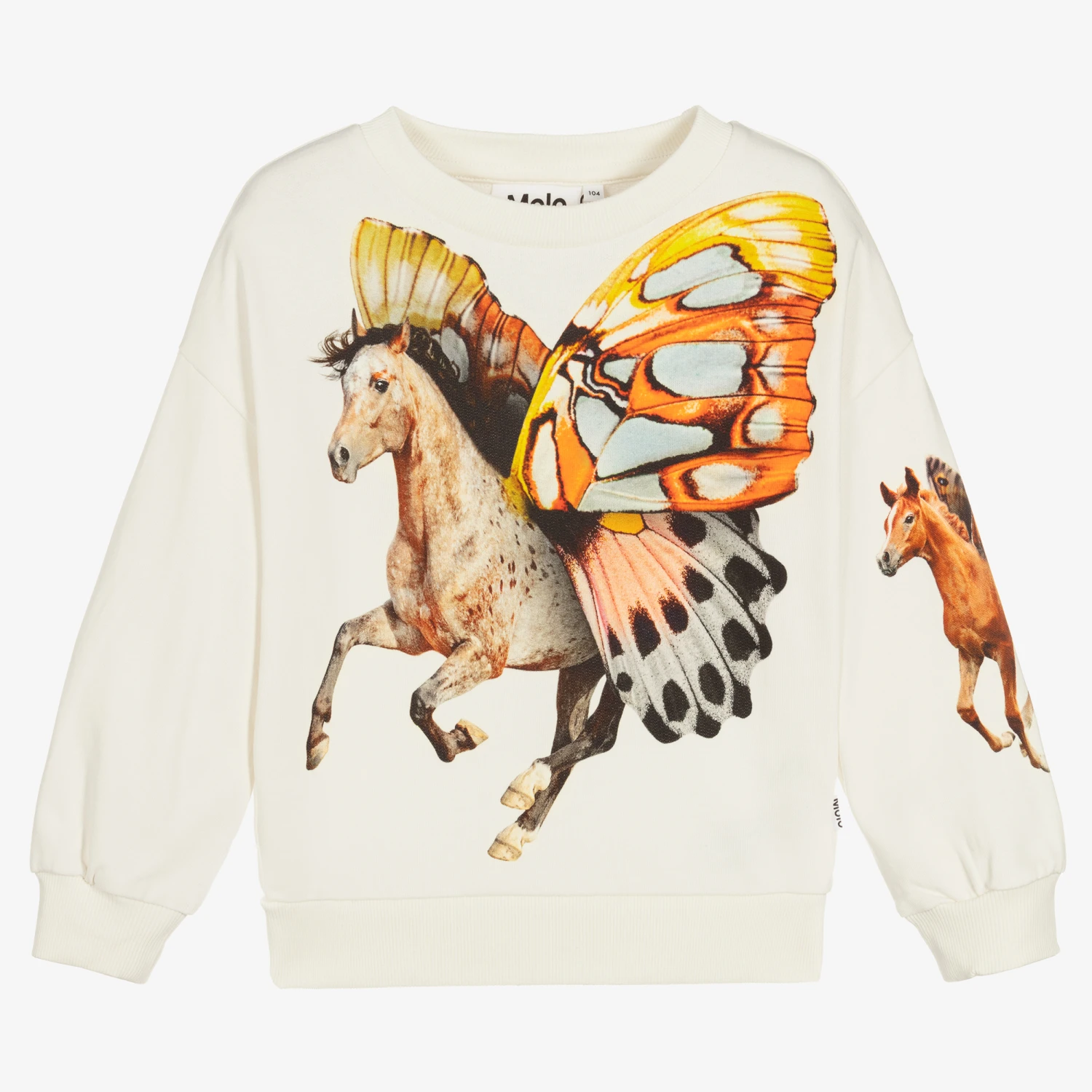 Ivory crew neck sweatshirt for girls by Danish brand Molo. Made in soft organic cotton jersey, it has a beautiful winged horse print on the front for a nature-inspired look, and stretchy ribbed trims.