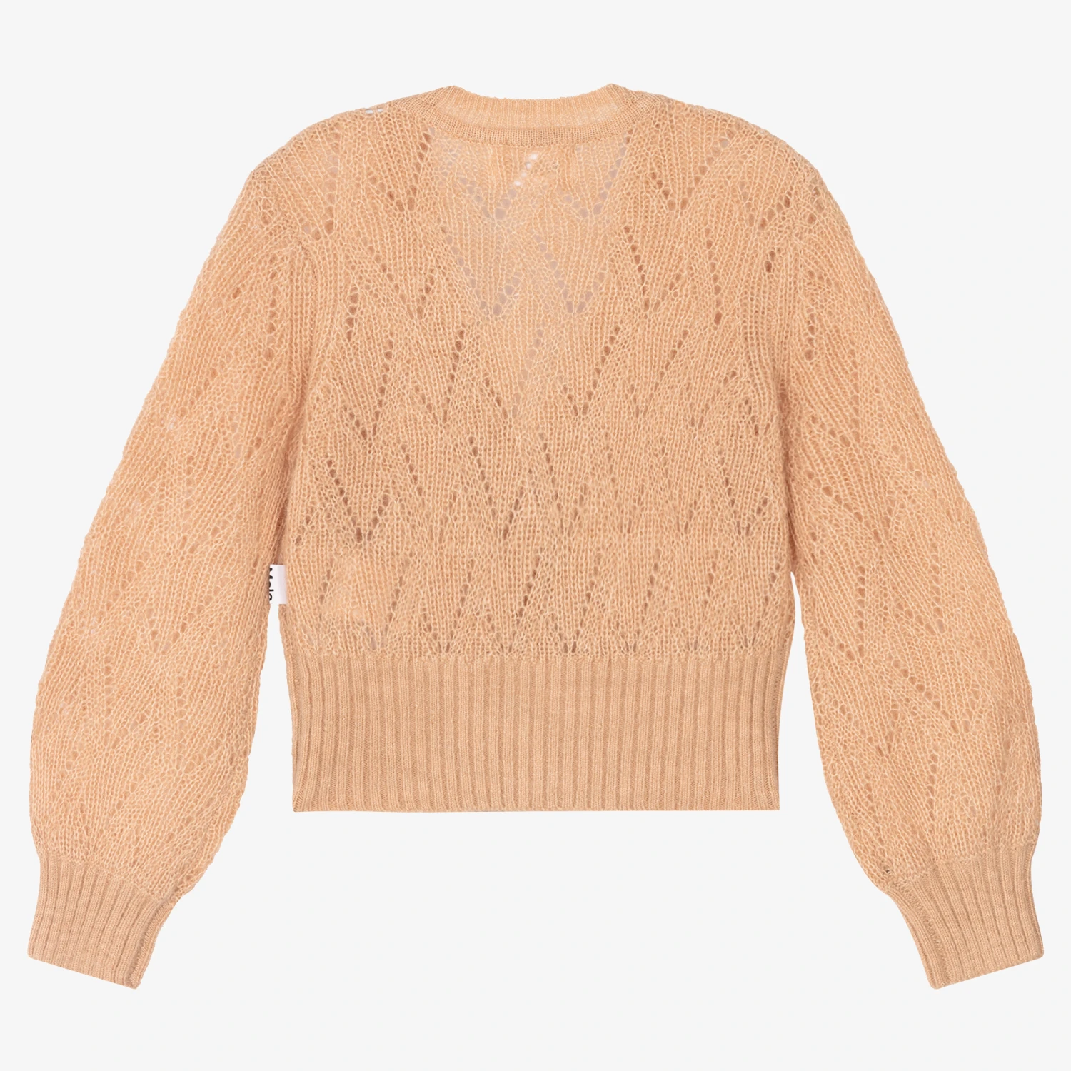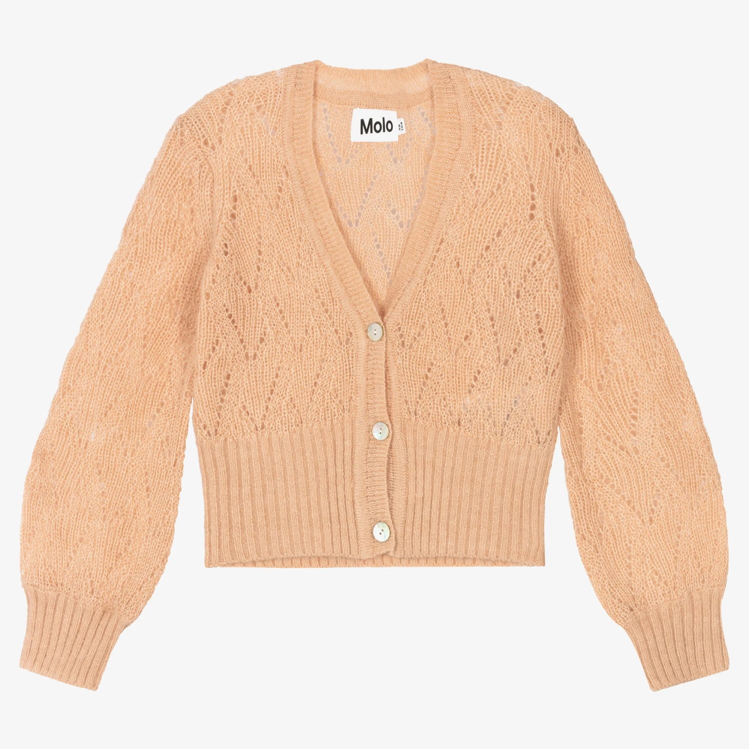 Casual rose pink cardigan for girls by Molo, loosely knitted in a soft and warm Alpaca wool blend. Longer in the sleeves, this v-neck cardigan has a wide ribbed hem for a short, relaxed fit. It has pearlized button fastenings on the front and ribbed cuffs on the wrists for added comfort.