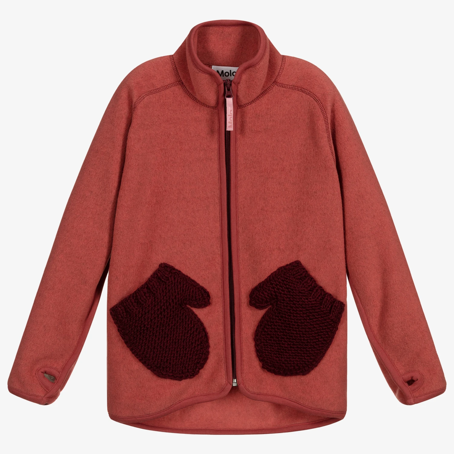 Red zip-up top for girls, by Molo. Made from soft polyester fleece, it has cute deep red knitted mitten shaped pockets on the front and thumb holes on the sleeves.