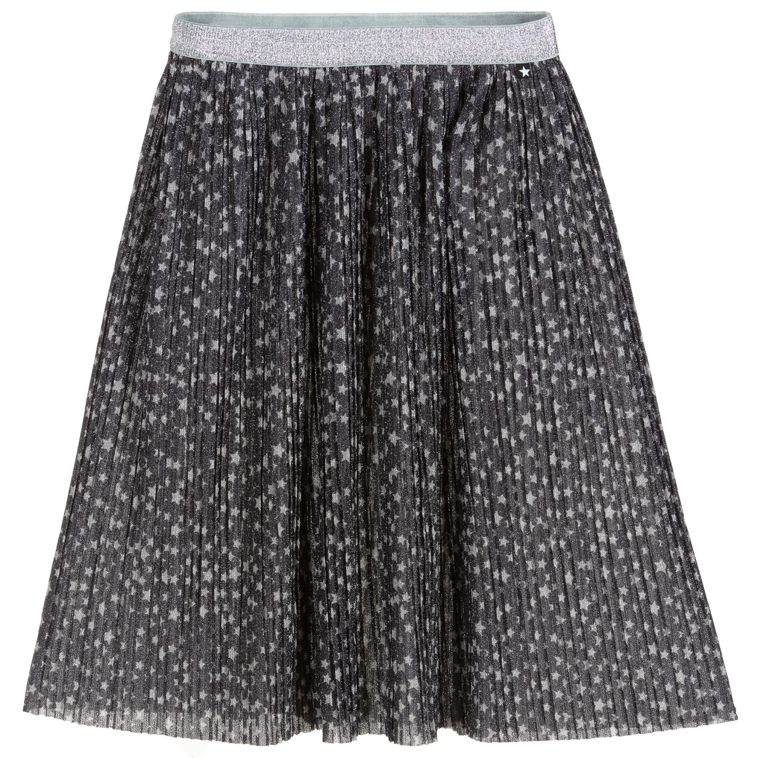Girls lovely, glittery grey pleated skirt with a silver star print by Molo. Made in a soft and stretchy polyester blend, it has a glittery silver elasticated waistband.