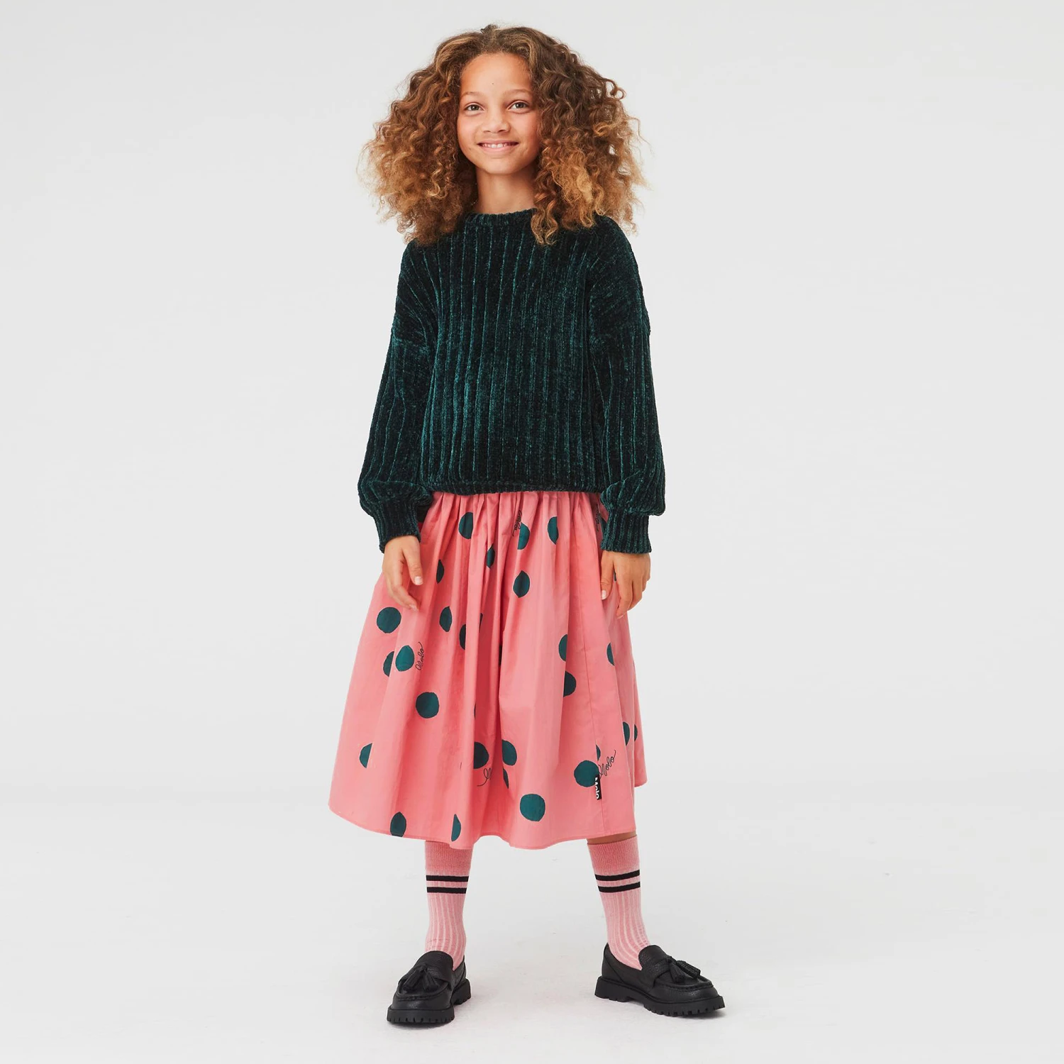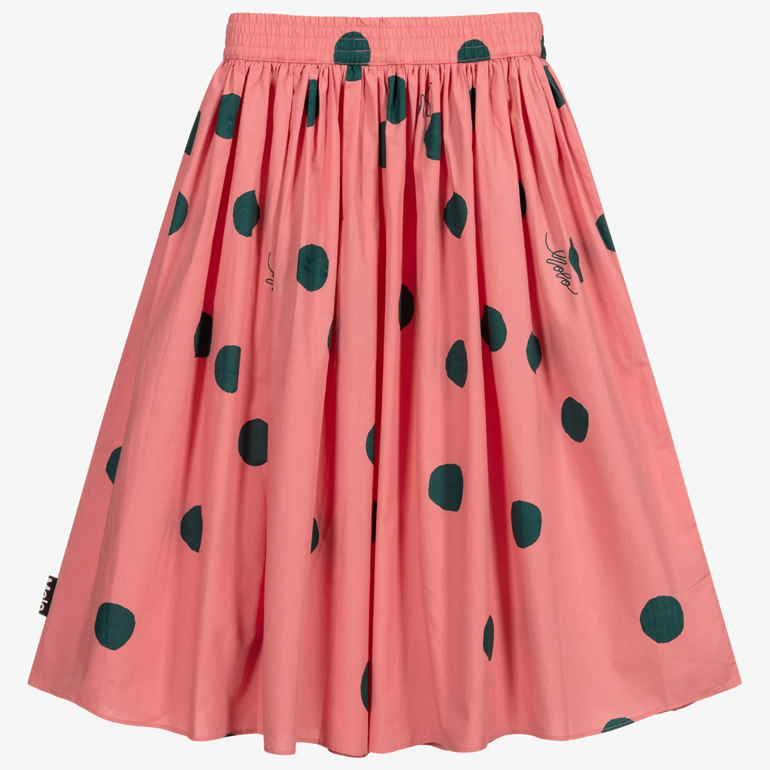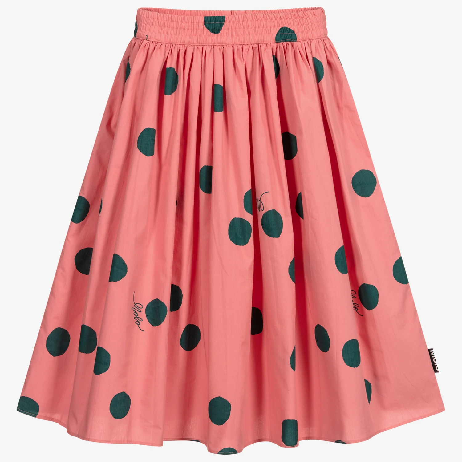 Pink skirt for girls by Molo. Made with soft and lightweight organic cotton, it has dark green polka dots and is decorated with logo prints. The waist is elasticated for comfort.