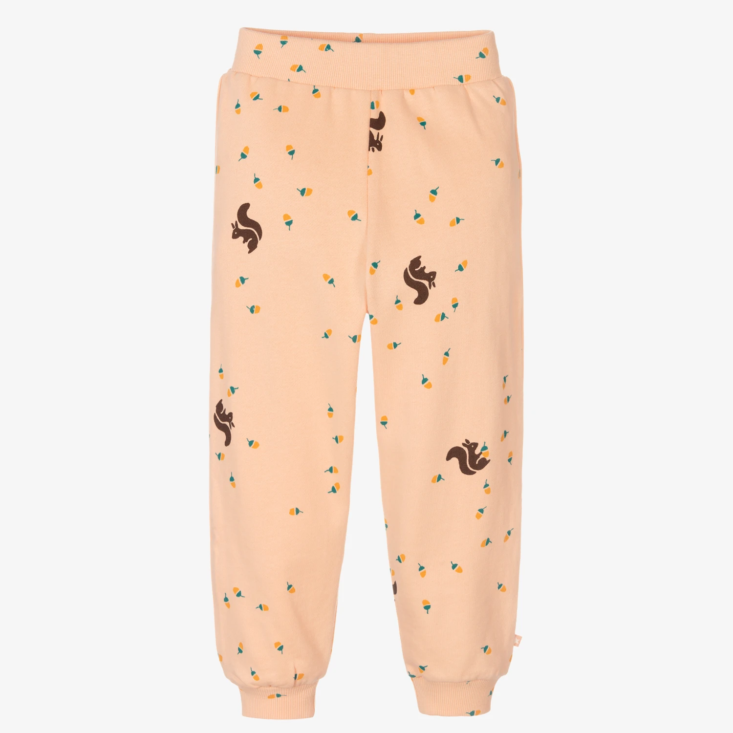 Little girls pale pink organic cotton joggers from Danish brand Molo. Made in stretchy, comfortable sweatshirt jersey, there are little squirrel and acorn prints in brown, teal green and mustard yellow. The elasticated waist and cuffs are ribbed, soft and gentle for delicate skin.