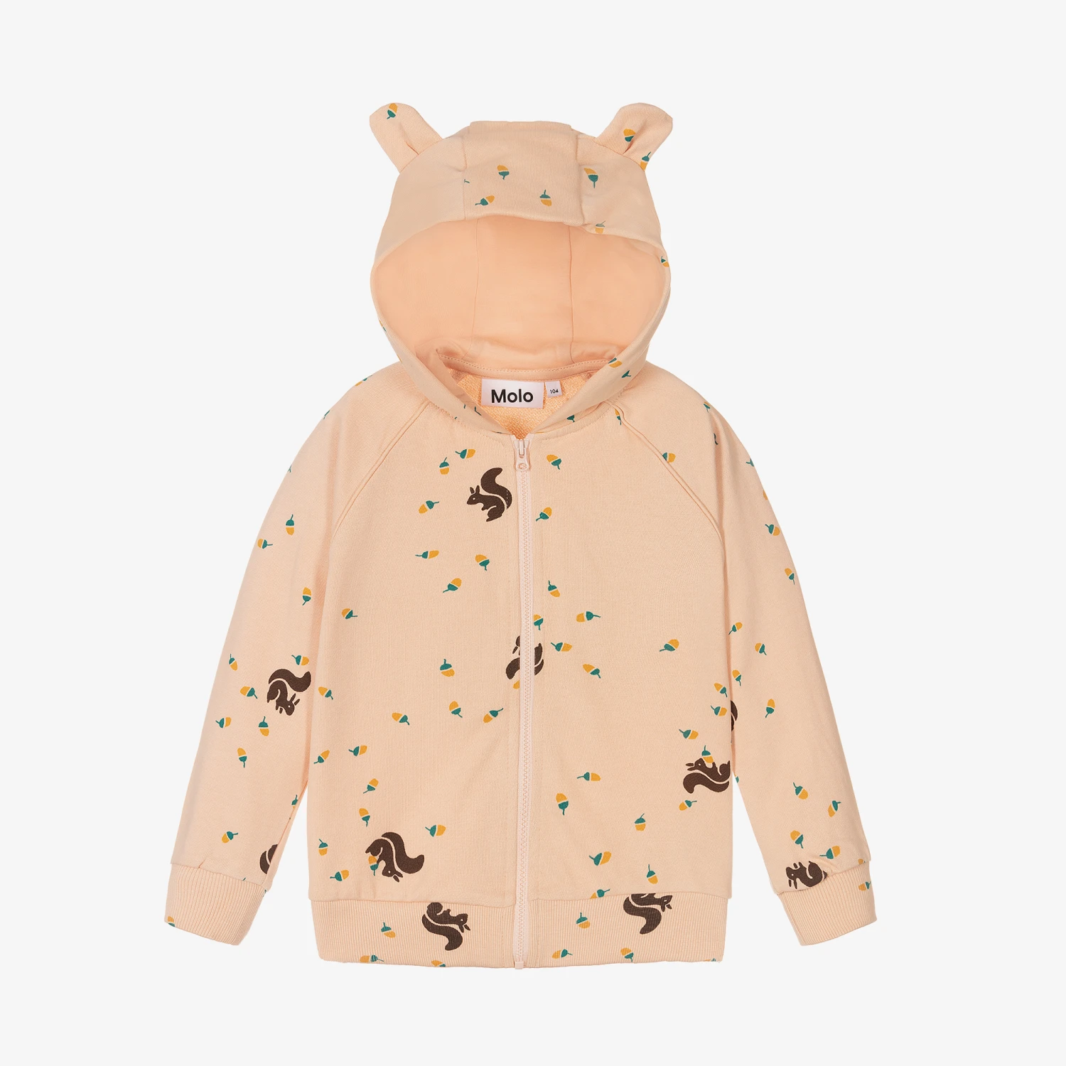 Little girls pale pink organic cotton zip-up top from Danish brand Molo. Made in stretchy, comfortable sweatshirt jersey, there are little squirrel and acorn prints in brown, teal green and mustard yellow. It has cute 3D animal ears on the hood and a front zip fastening for easy dressing.