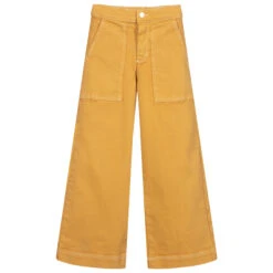 Girls honey yellow wide leg trousers by Molo. Made in mid-weight cotton drill, they are soft and stretchy and have a loose fit. They fasten with a button and zip and have an adjustable waist. There are patch pockets on the front and back.