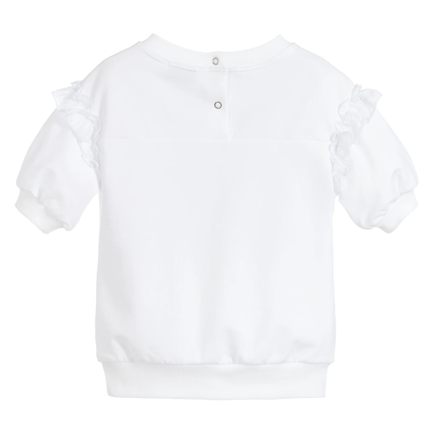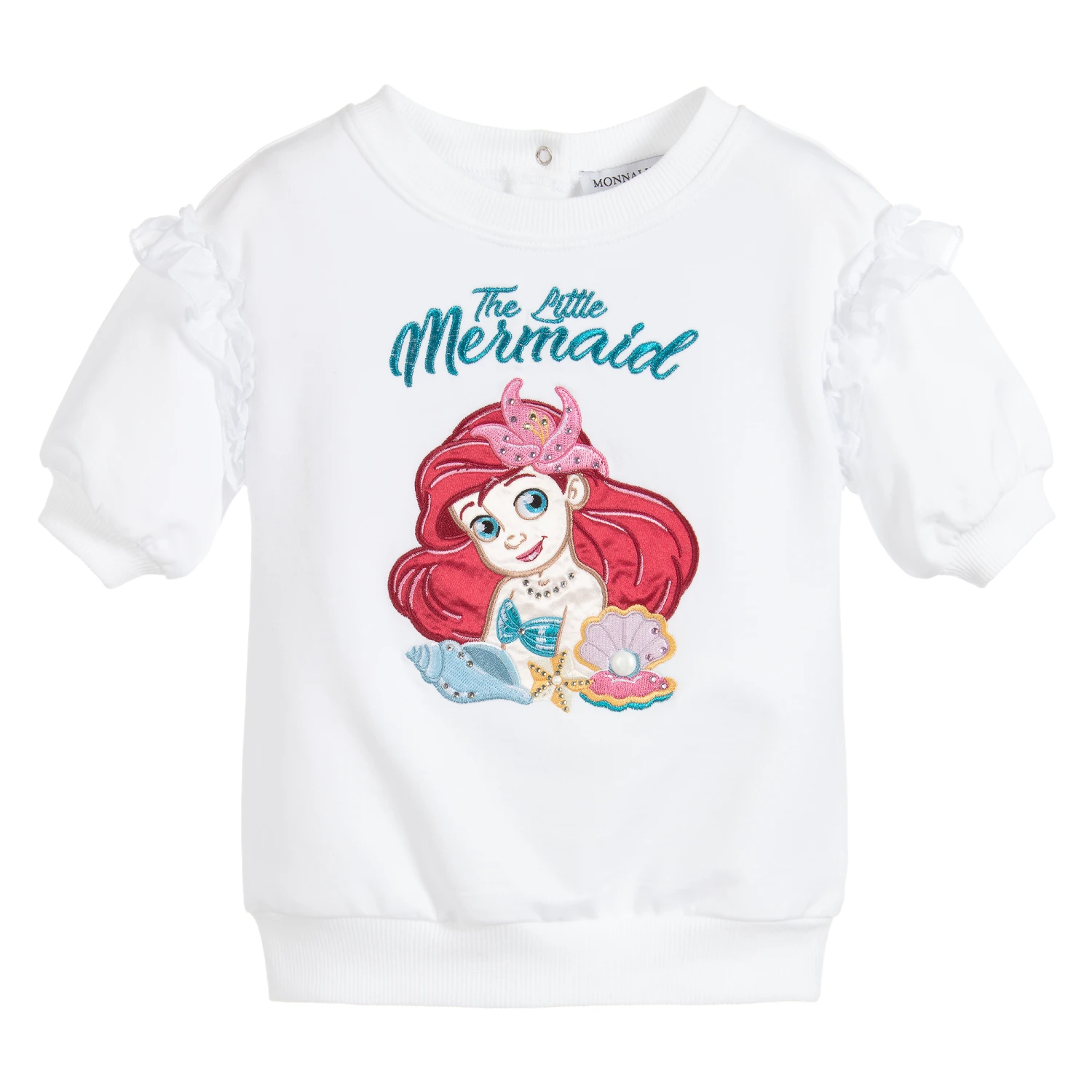 Baby girls white cotton sweatshirt dress from Monnalisa. The front has colourful Disney’s Ariel mermaid embroidery and sparkly diamanté. There are poppers on the back to fasten, 3/4 length sleeves and ruffle trims.