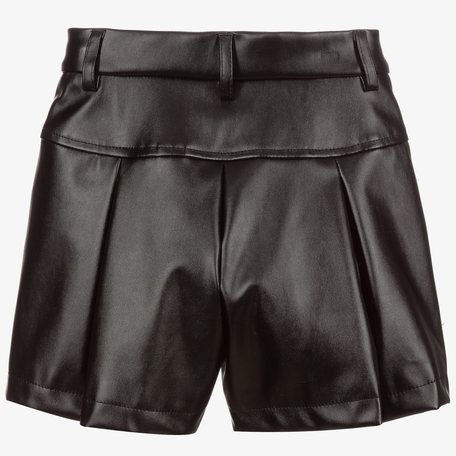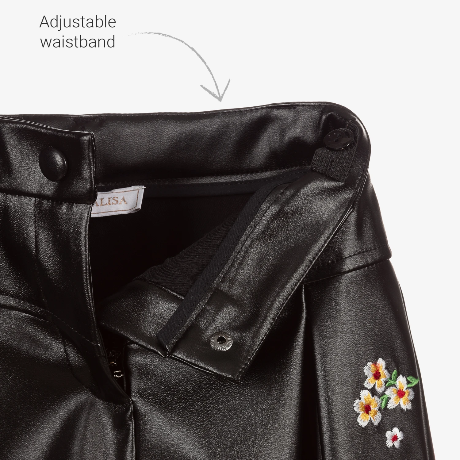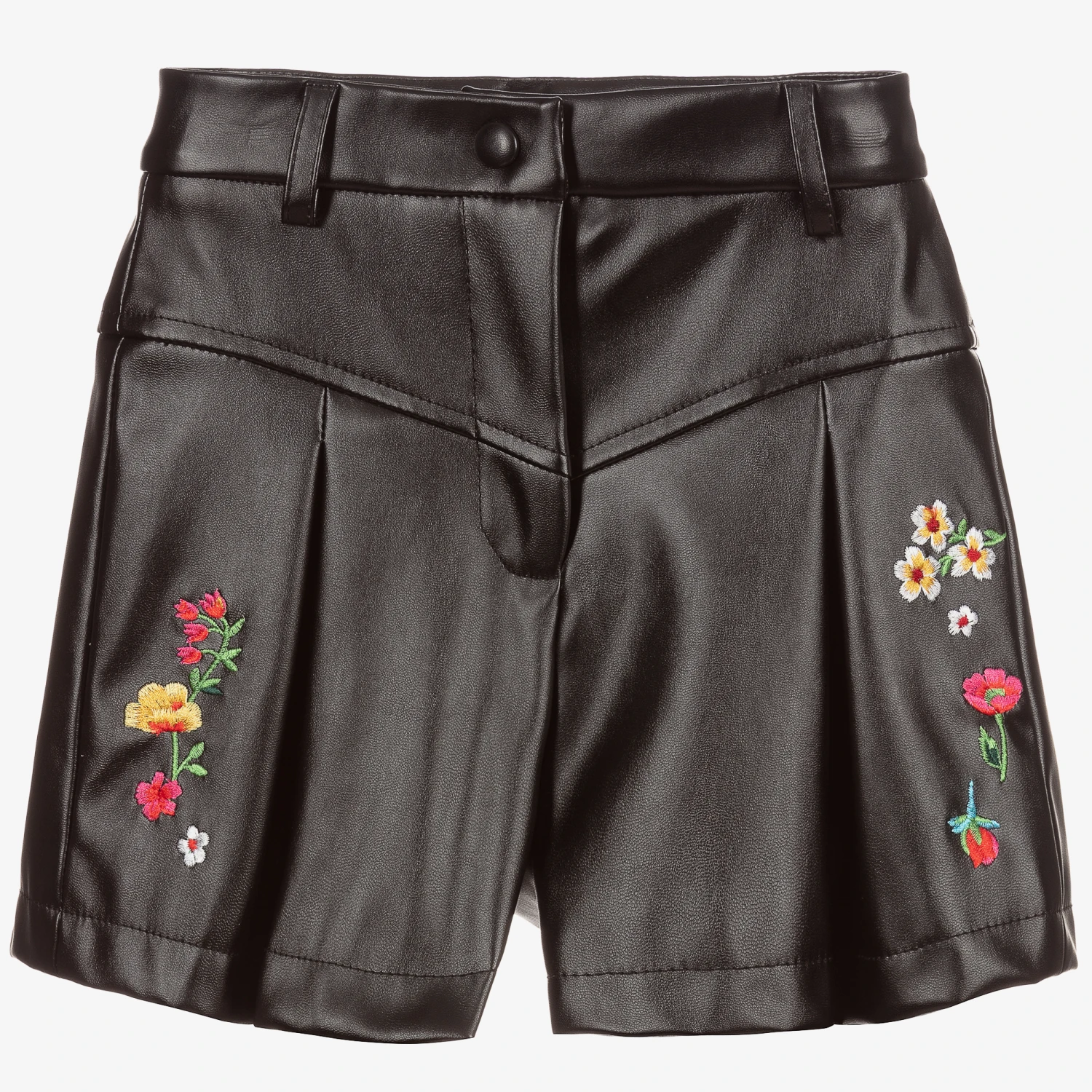 Girls black faux leather shorts from Monnalisa, with colourful floral embroidery. Fully lined, they have wide legs with soft pleats and an adjustable waist and fasten with a popper and zip.