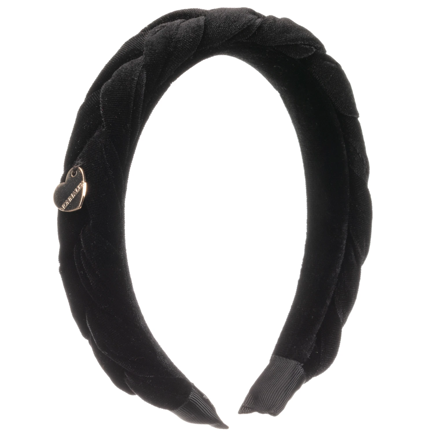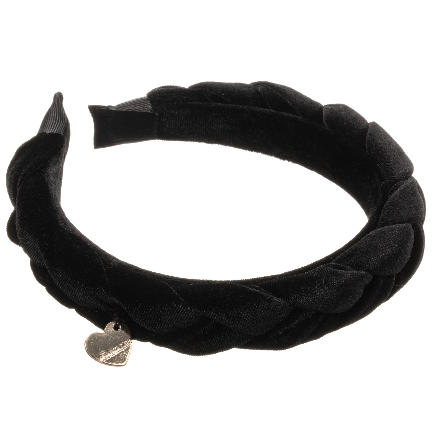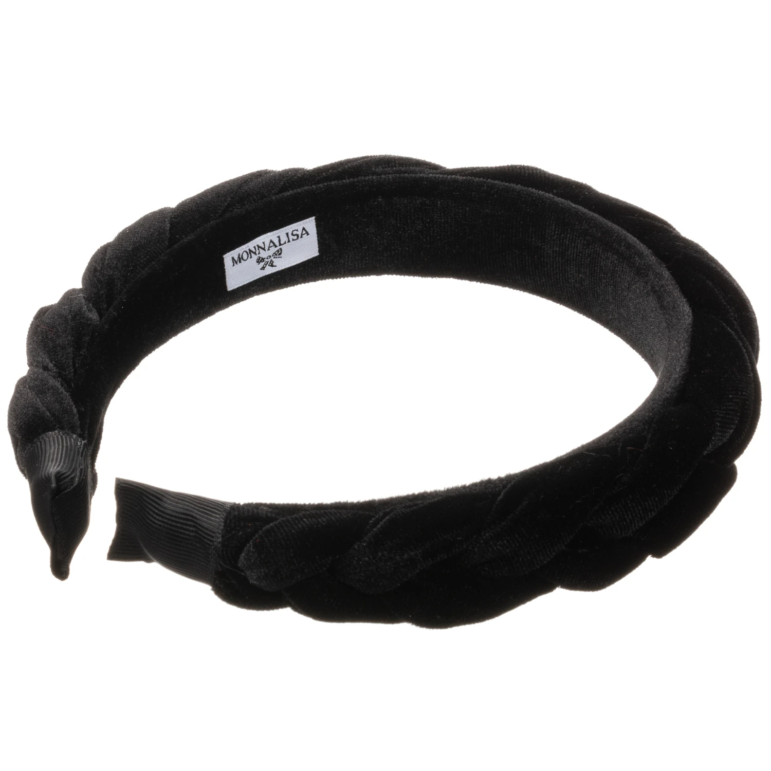 Smart black hairband by Italian designer Monnalisa. Made in plaited velvet, it has a comfortable, flexible band with grosgrain trims.