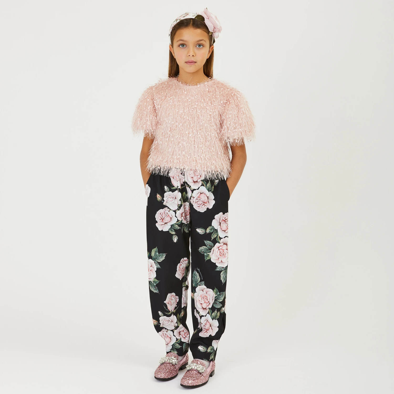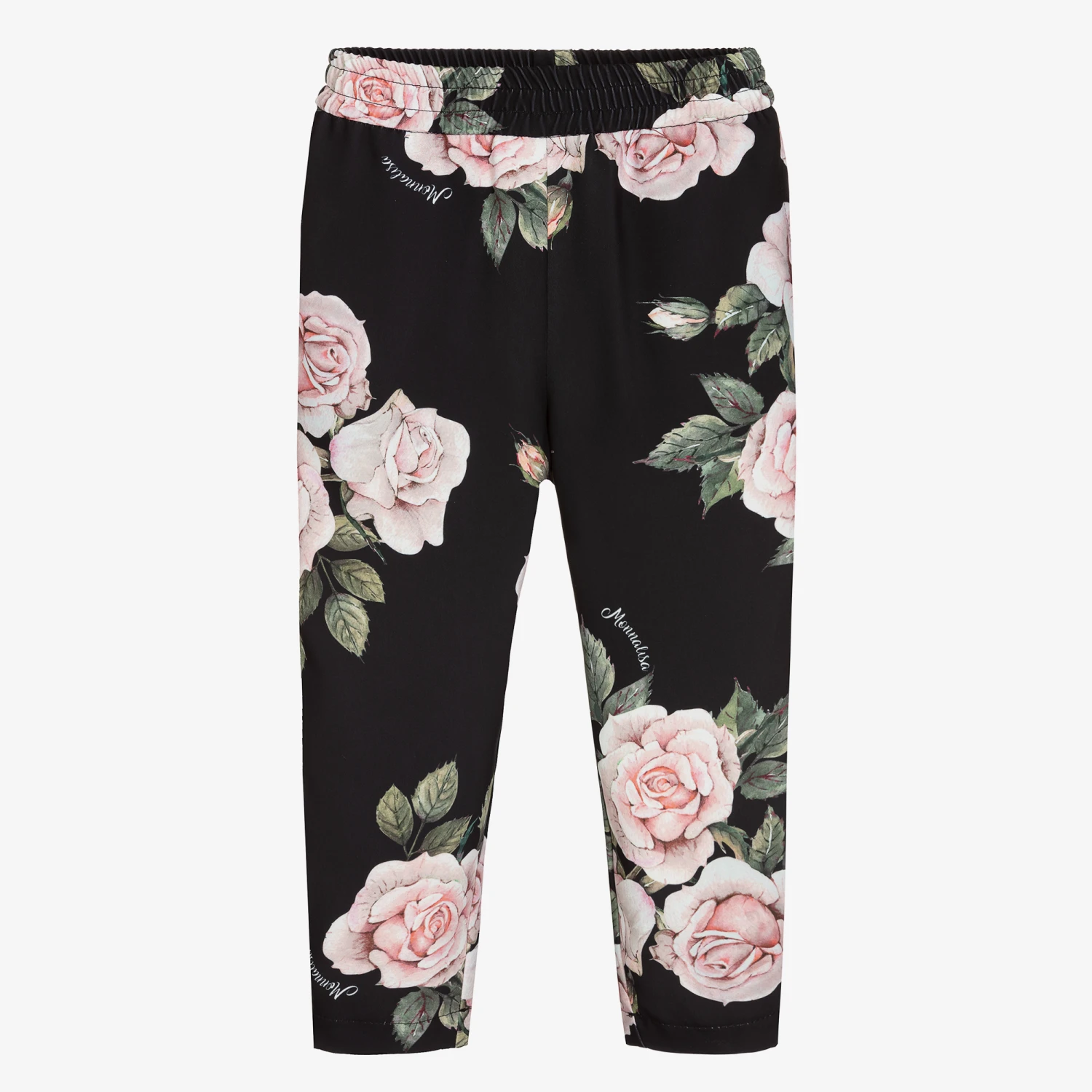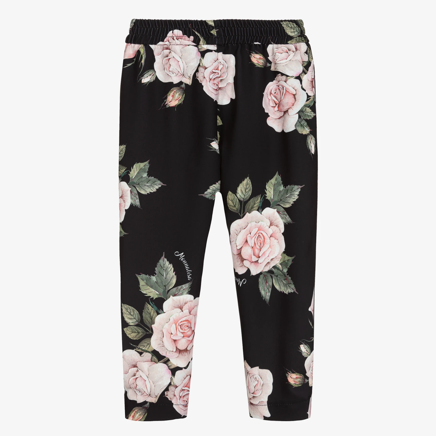 Smart black tapered trousers for girls by Monnalisa Chic, patterned with pink roses and logos. Made from silky smooth polyester, hey are loose-fitting and have a comfortable elasticated waistband. There are useful concealed pockets on the side seams.