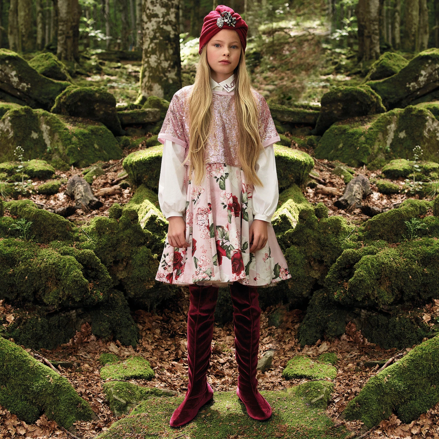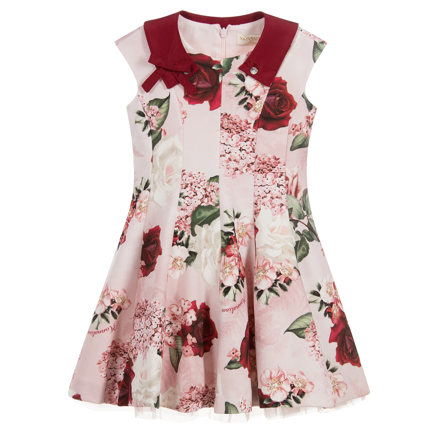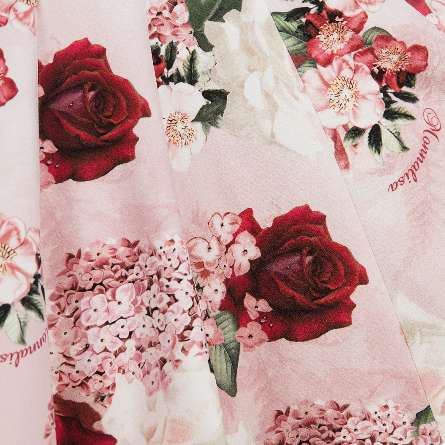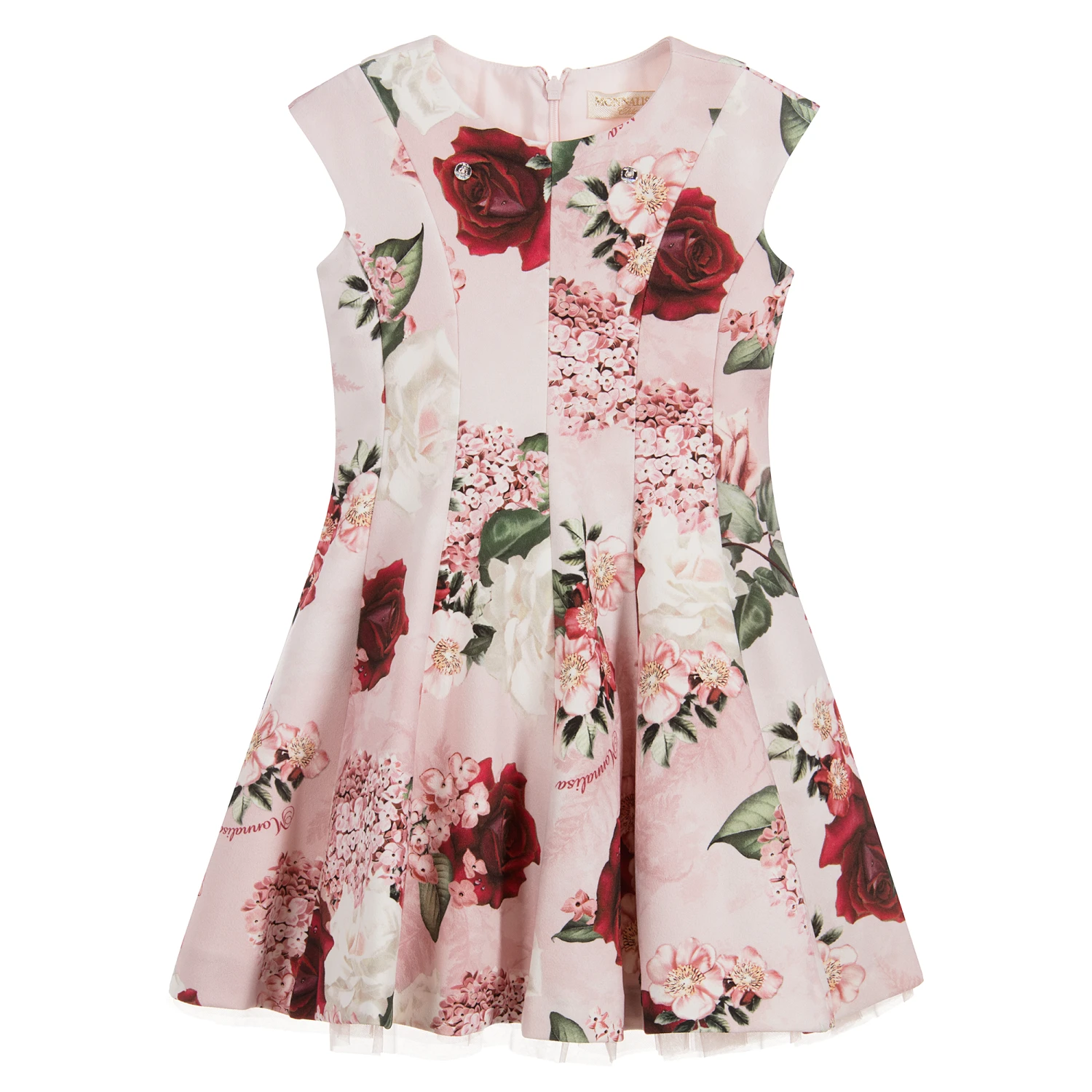 Girls gorgeous pink dress from Monnalisa Chic, with a pink, burgundy and ivory floral print. Made in luxuriously soft jersey, with a removable satin collar. The dress is fully lined in soft viscose twill, with tulle layers on the hem to add volume to the skirt.