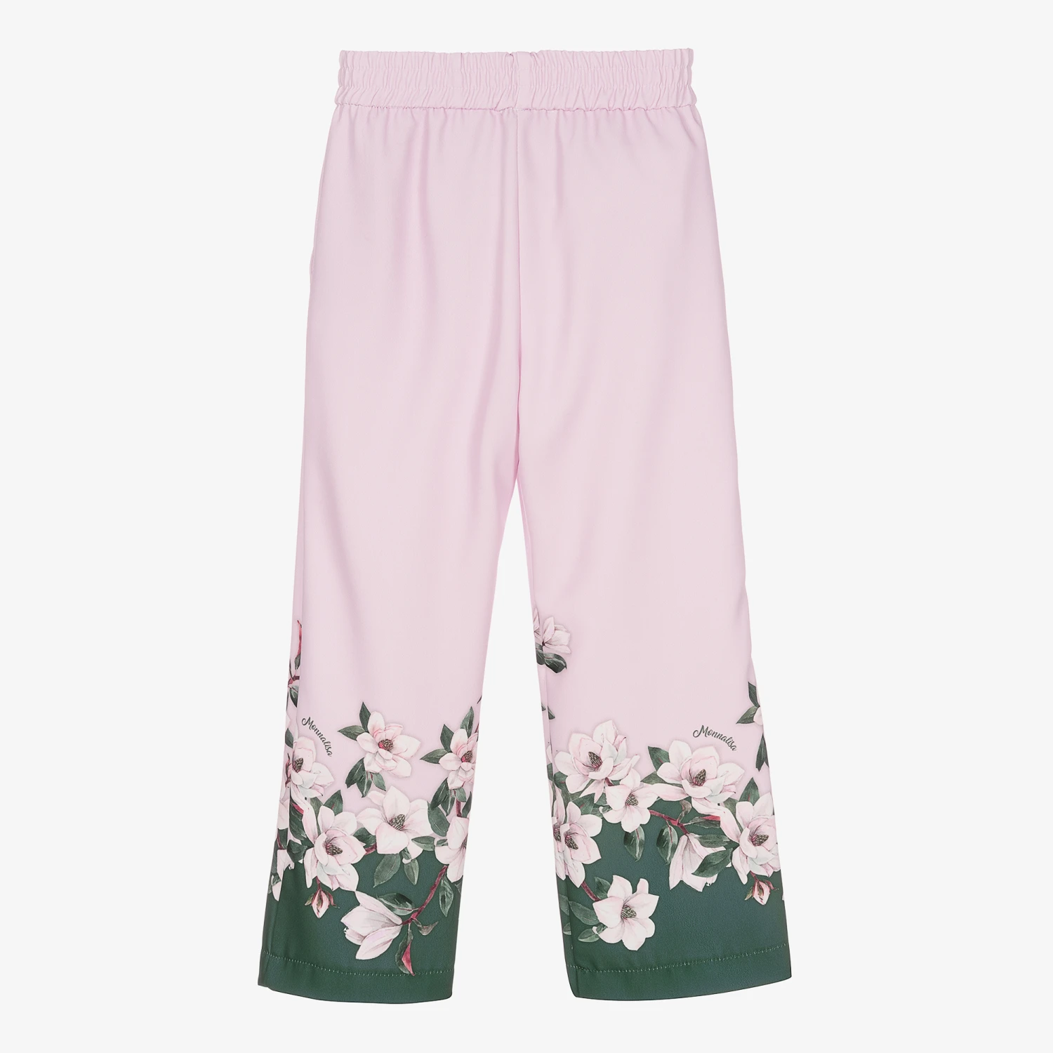 Pretty pink and green floral print trousers for girls by Italian designer Monnalisa. Lightweight and elegant with a beautiful drape, these wide leg trousers have jetted side pockets and an elasticated waistband for comfort and fit.