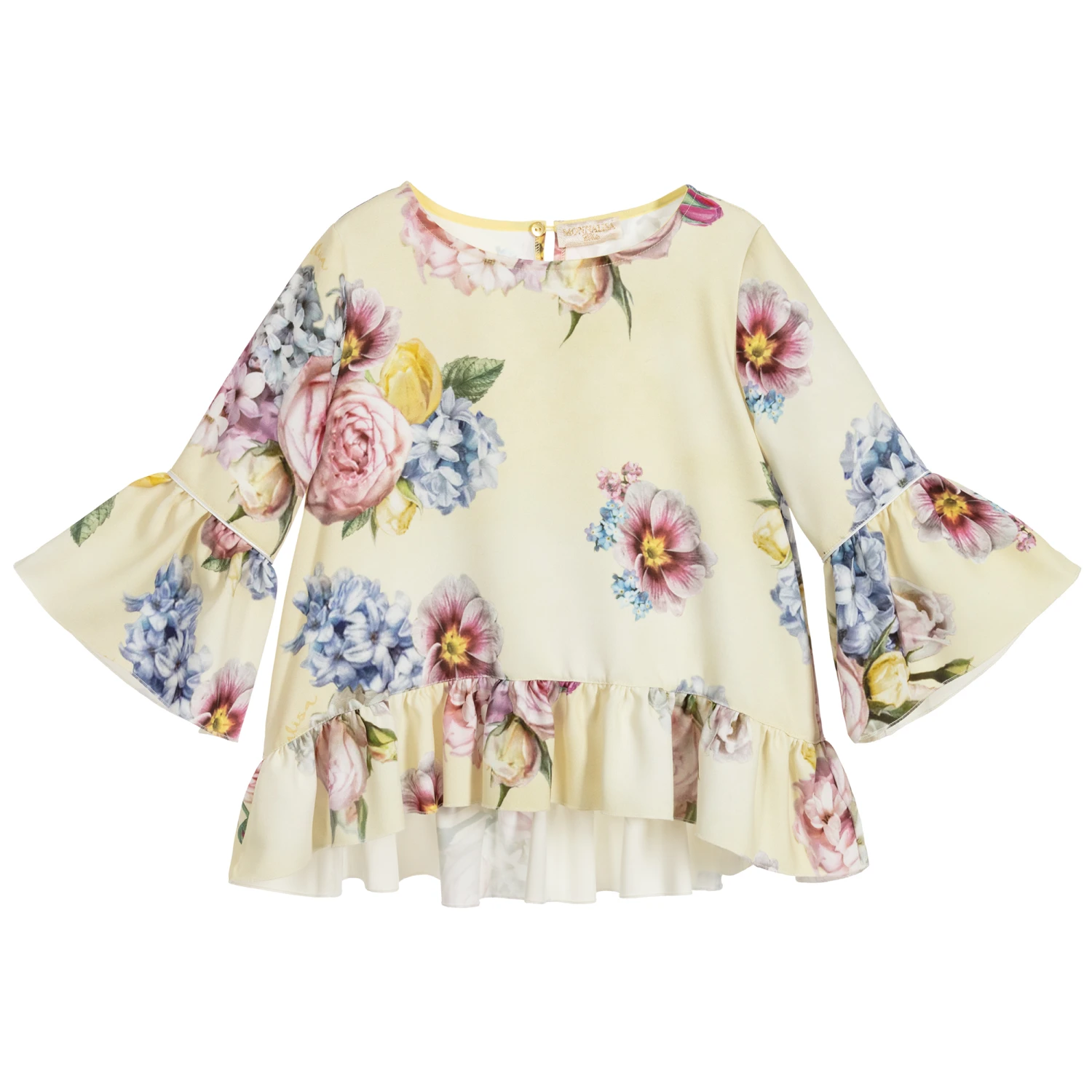 Soft silky blouse by Monnalisa Chic, with a pink and blue floral print on a yellow background. There are peplum trims on the fluted sleeves and hem, with the back cut longer than the front.