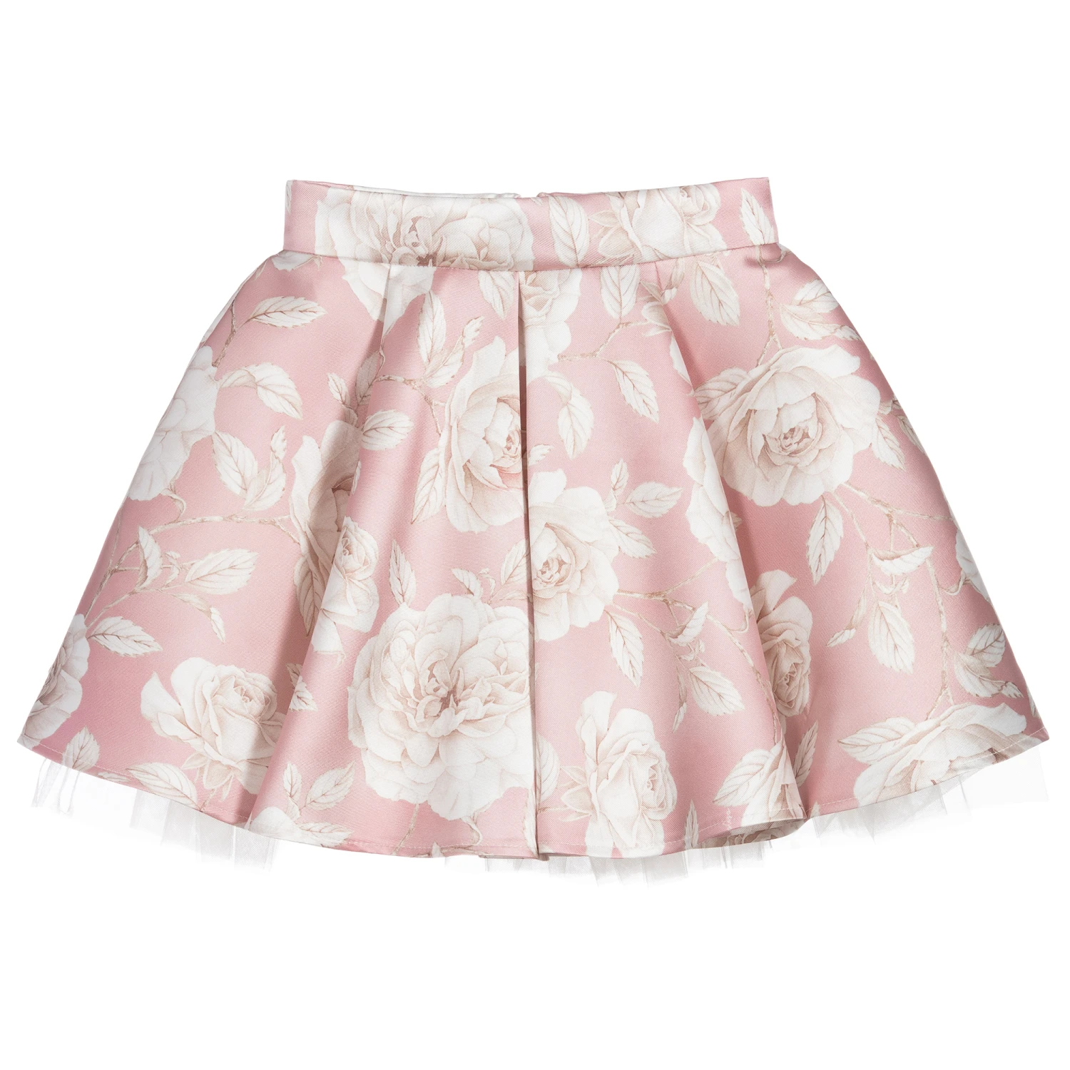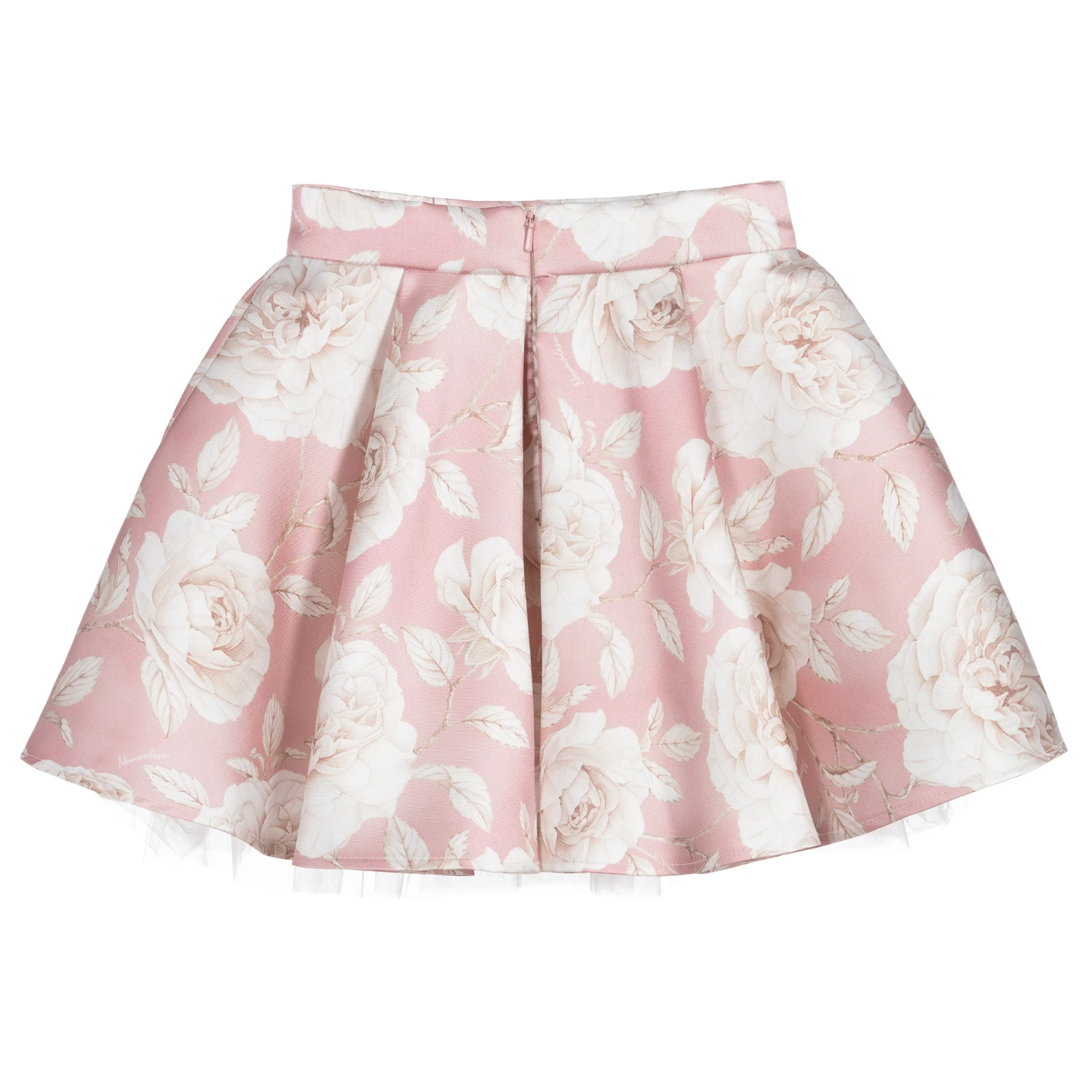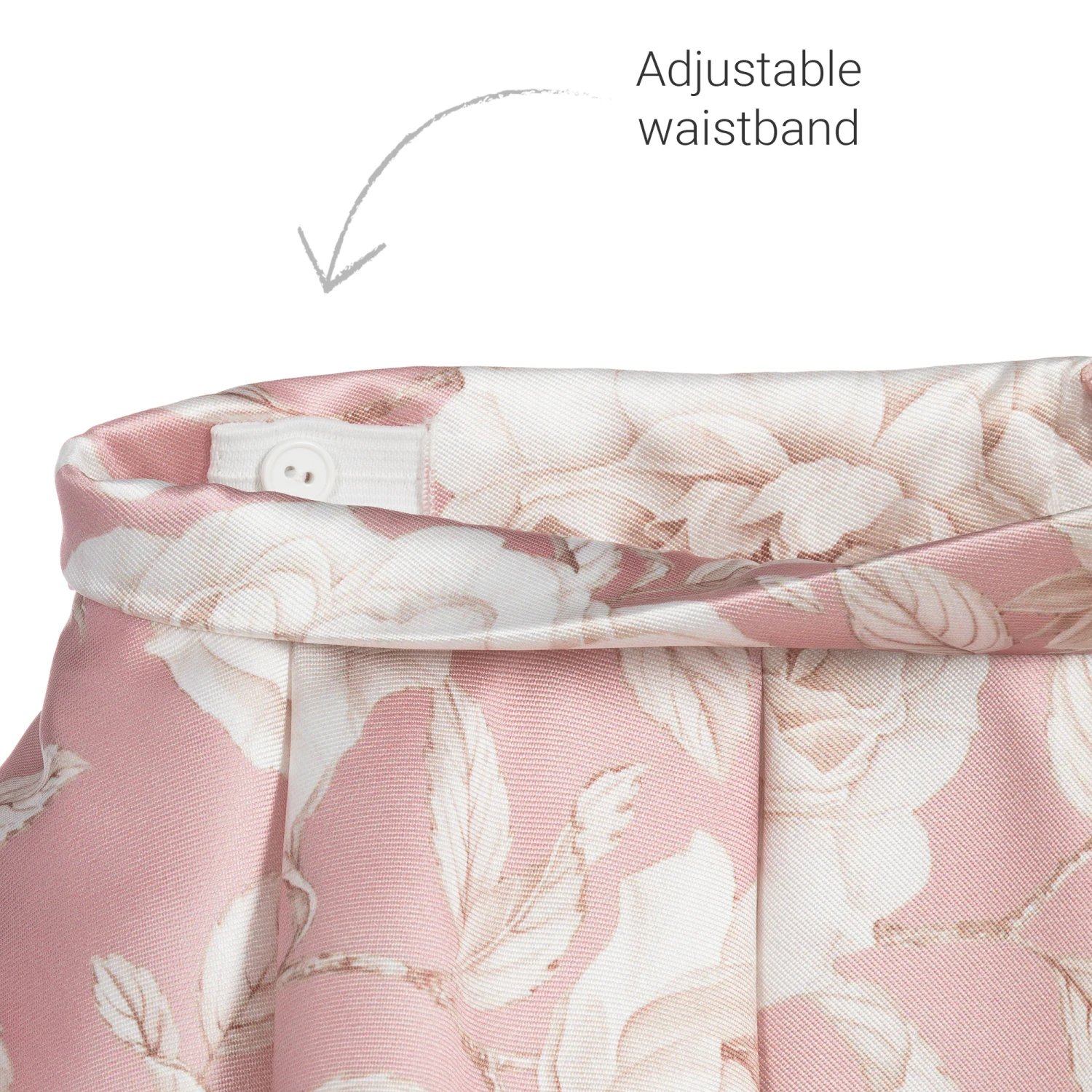 Pretty pink skirt for girls by Monnalisa Chic, with an ivory floral print. Made in soft polyester with a sheen, it is pleated and has a useful, adjustable waistband.
