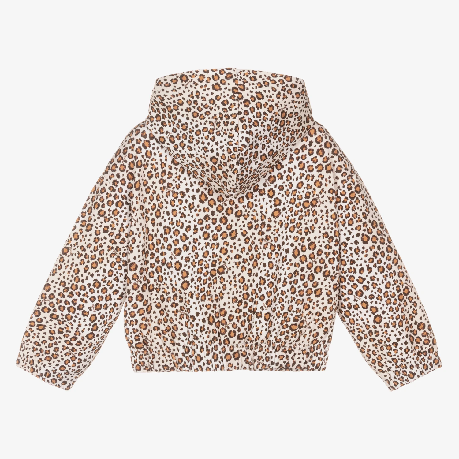 Beige zip-up hoodie for girls by Italian brand Monnalisa, made in soft, stretchy cotton jersey. Patterned with a bold, all-over leopard print, with an elasticated hem and elasticated cuffs for added comfort. It has a front zip fastening and concealed front pockets.
