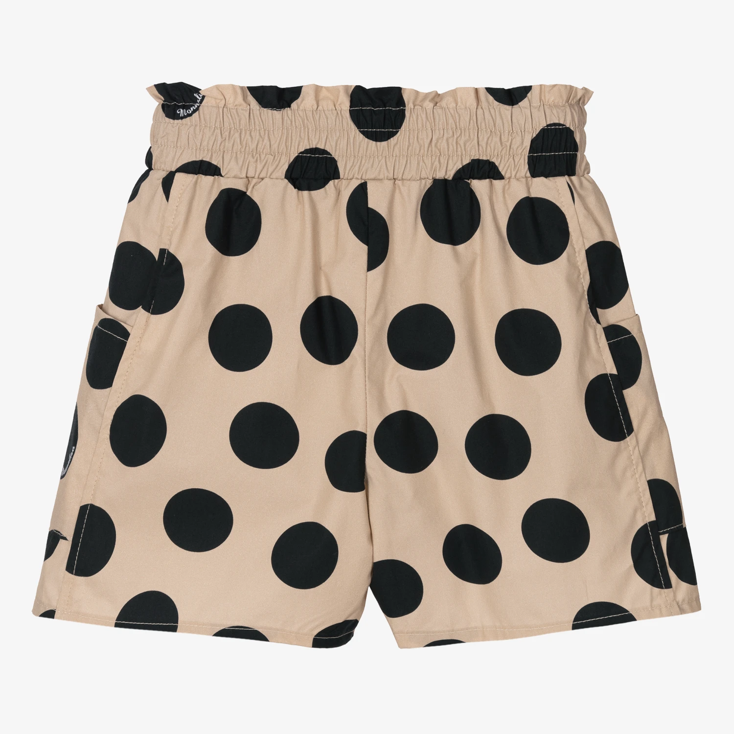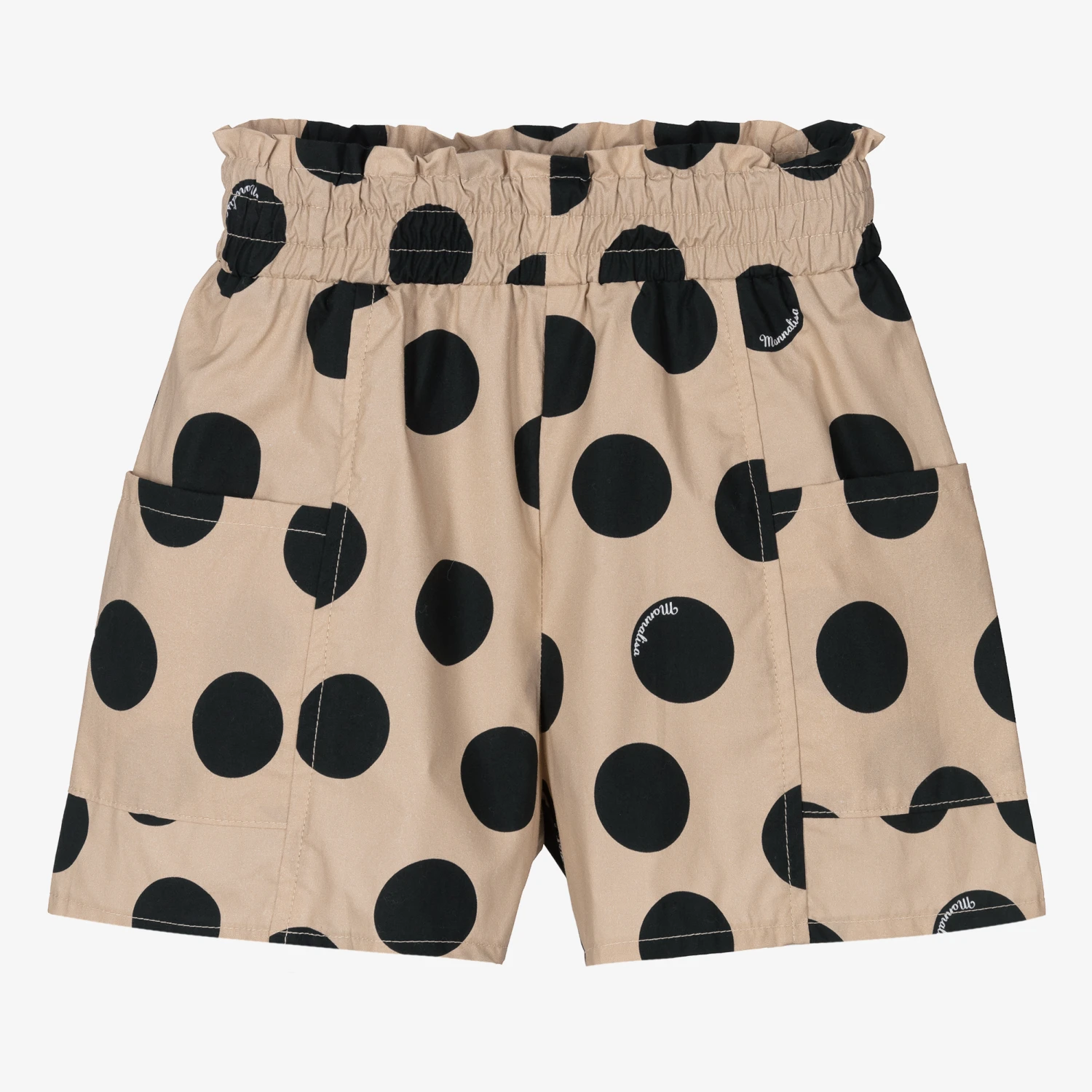 Beautiful beige polka dot shorts for girls by Italian designer Monnalisa, made in the softest cotton poplin. Effortlessly chic, they have an elasticated paperpag waist and patch pockets on the front.