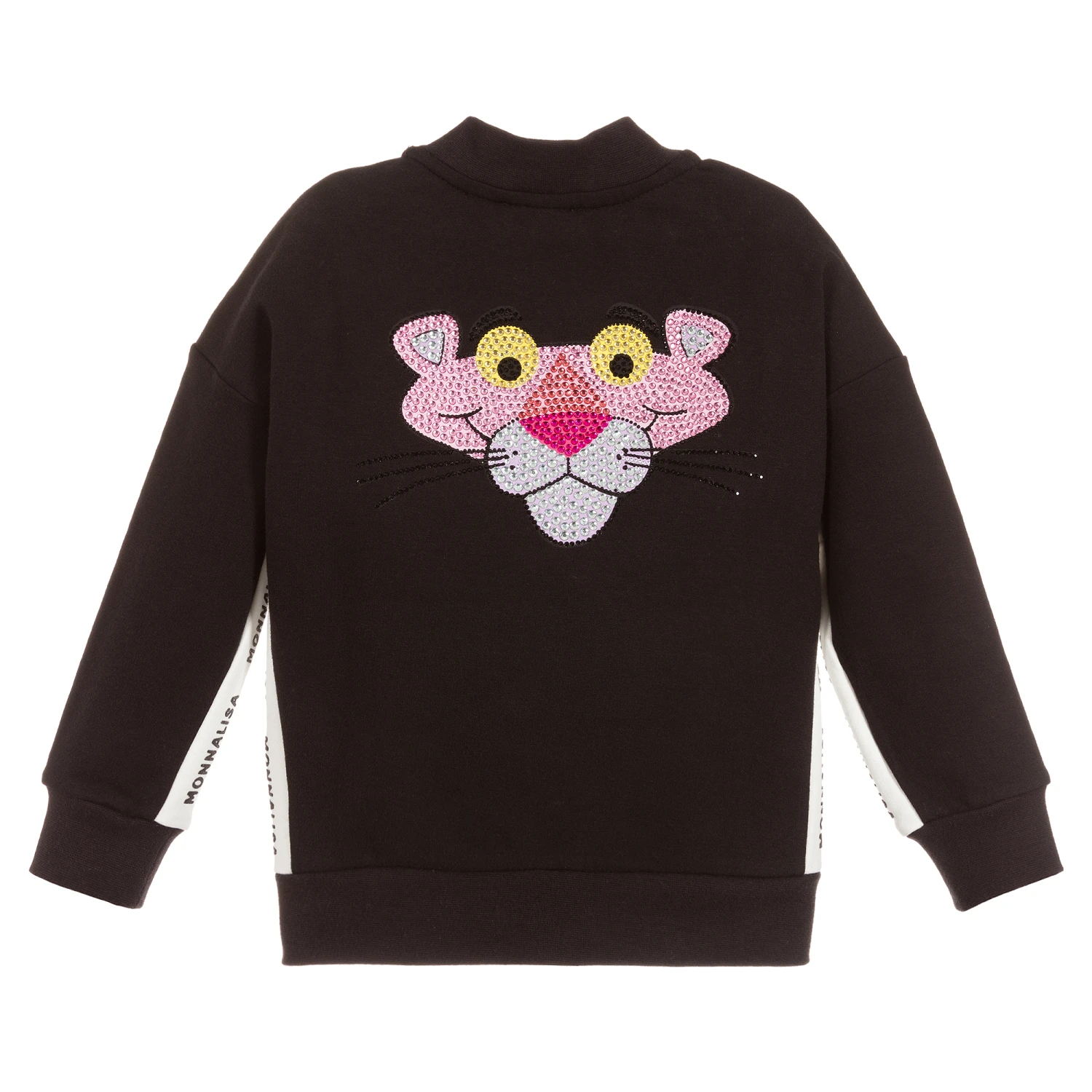 Girls black zip-up top fromย Monnalisa, made in soft cotton sweatshirt jersey, with a brushed feel inside. It has a diamantรฉ Pink Panther print on the back and ‘I love rock’ print on the front. There are white repeated logo stripes on the sides.
