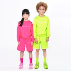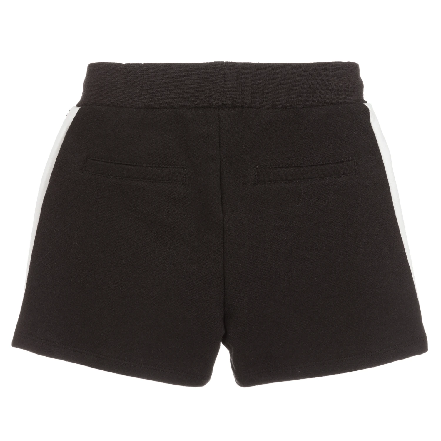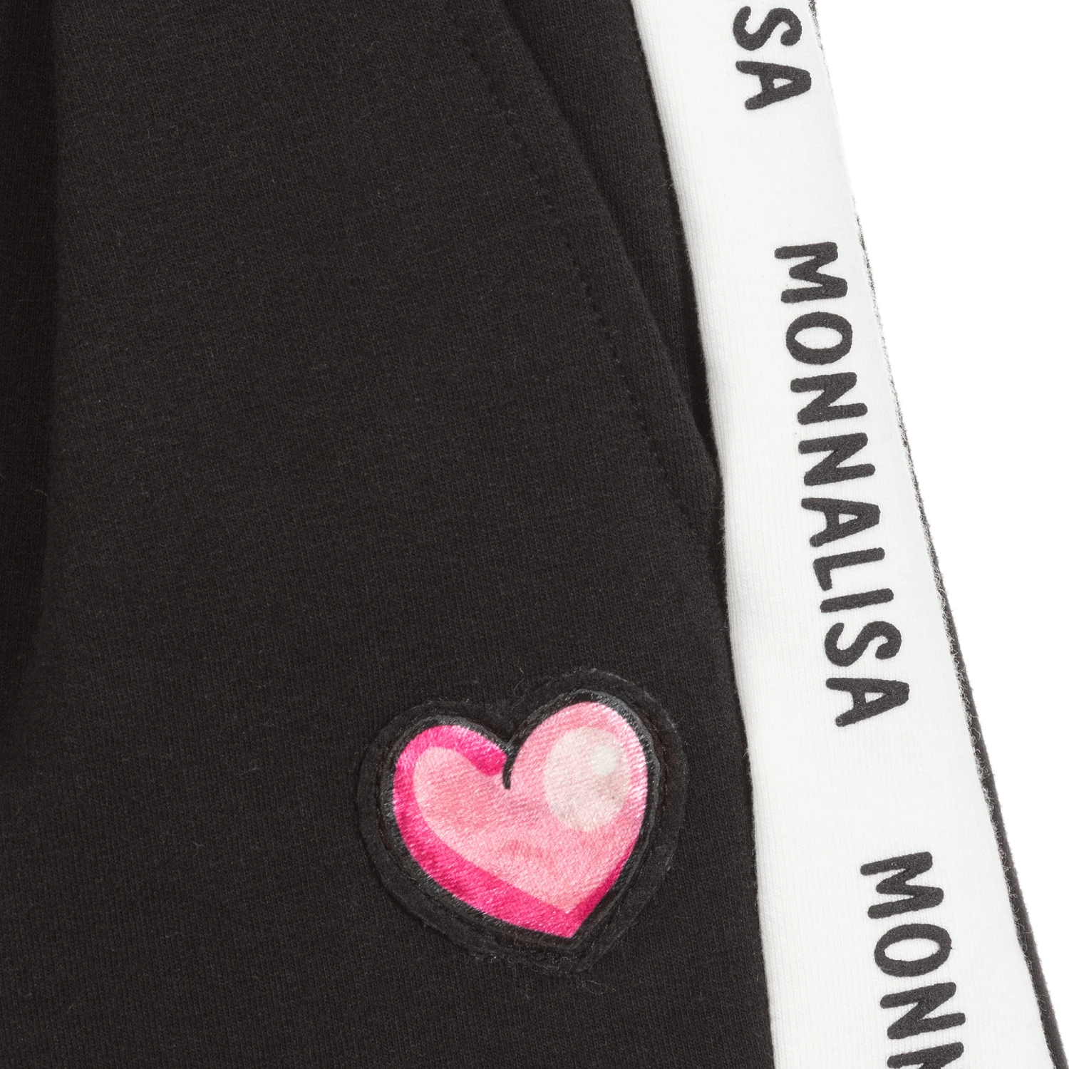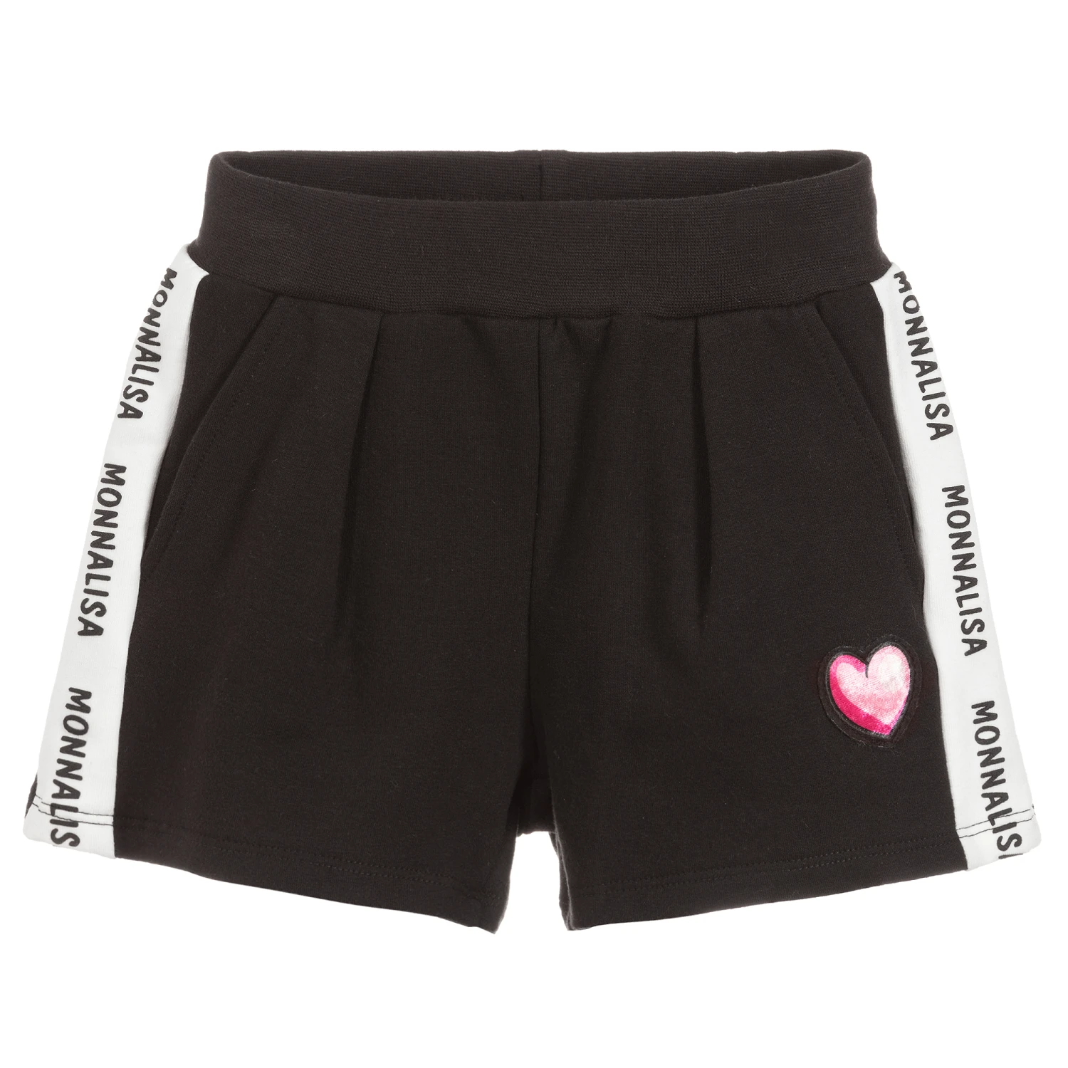 Girls black shorts from Monnalisa, made in soft cotton sweatshirt jersey, with a brushed feel inside. They have a pink satin heart on the front and white repeated logo stripes on the sides. The waistband is elasticated for a comfortable fit.