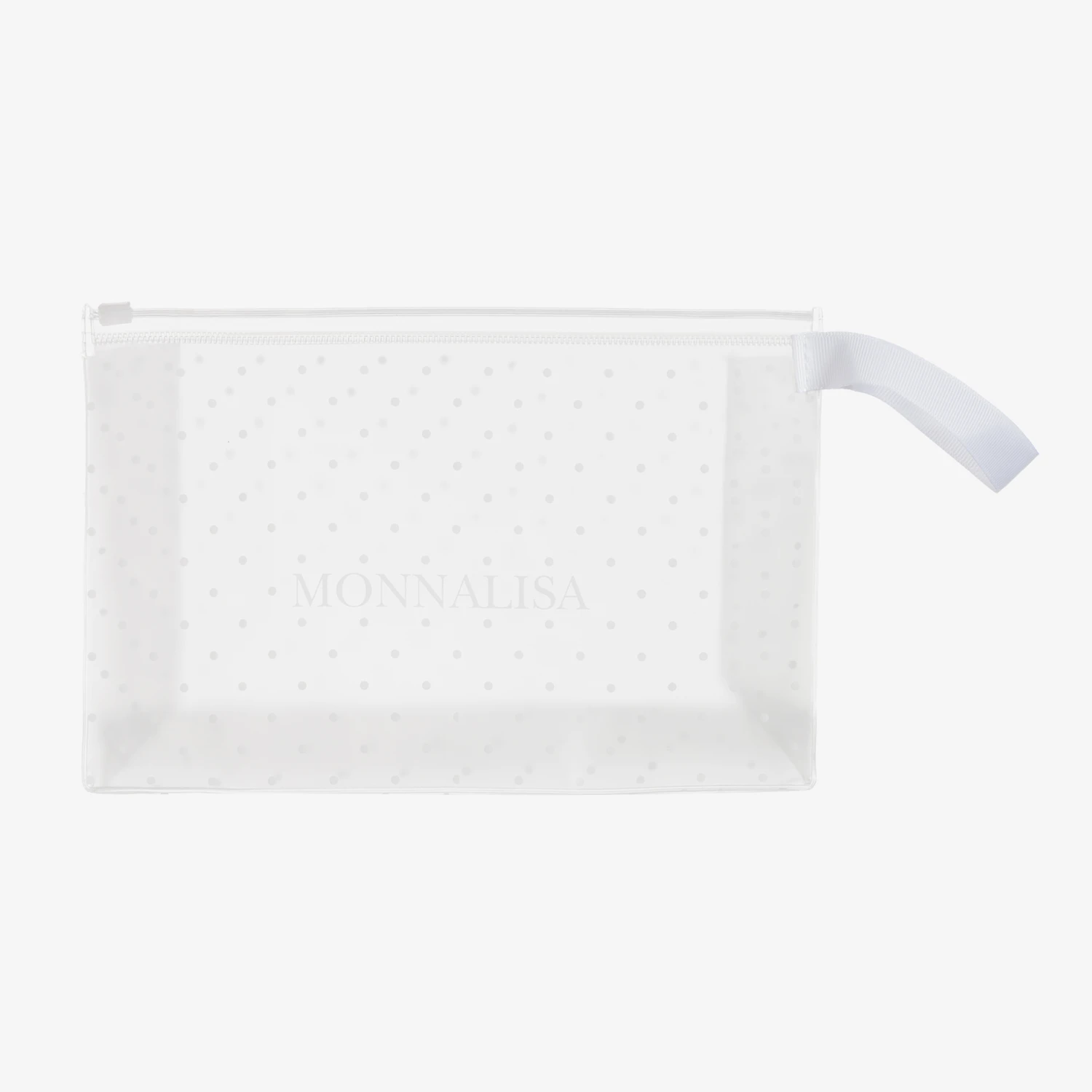 Black and white bikini for girls by Monnalisa, made in soft and stretchy polyester. Fully lined, both the top and bottoms have a star print and frilly trims. The top has adjustable shoulder straps and a clip fastening on the back.