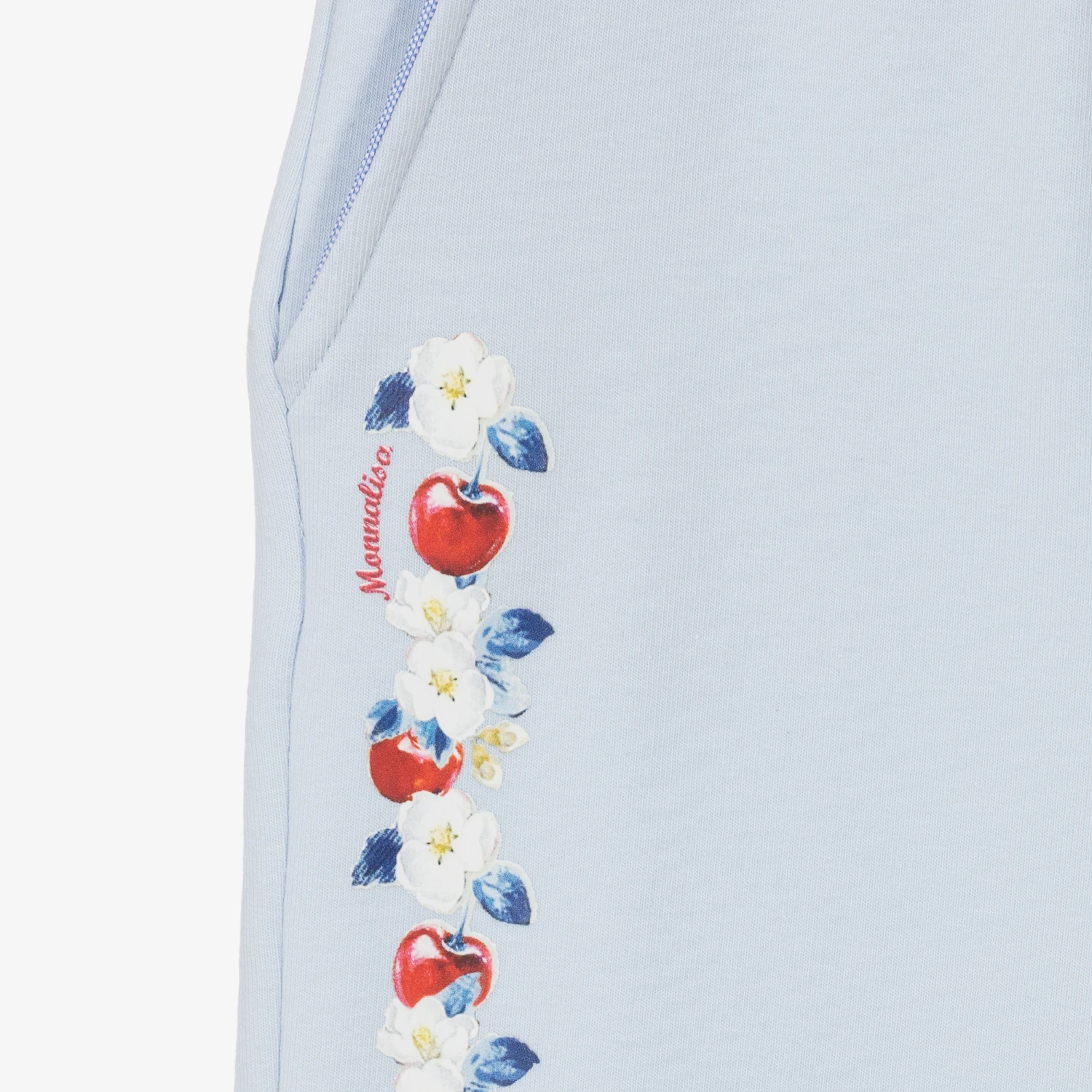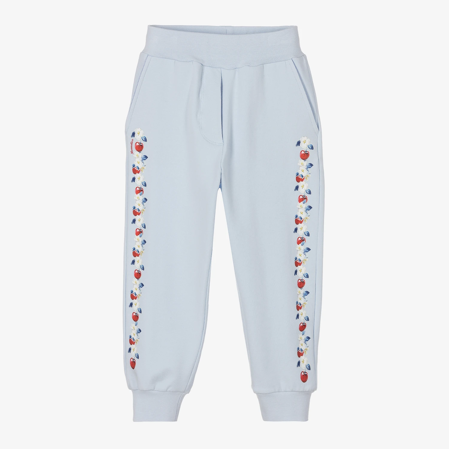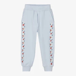 Making a timeless modern statement are these blue joggers for girls, by Italian designer Monnalisa. Made in luxuriously soft cotton jersey with a looped underside, they have a charming floral cherry print on the front, with cosy pockets and elasticated trims.