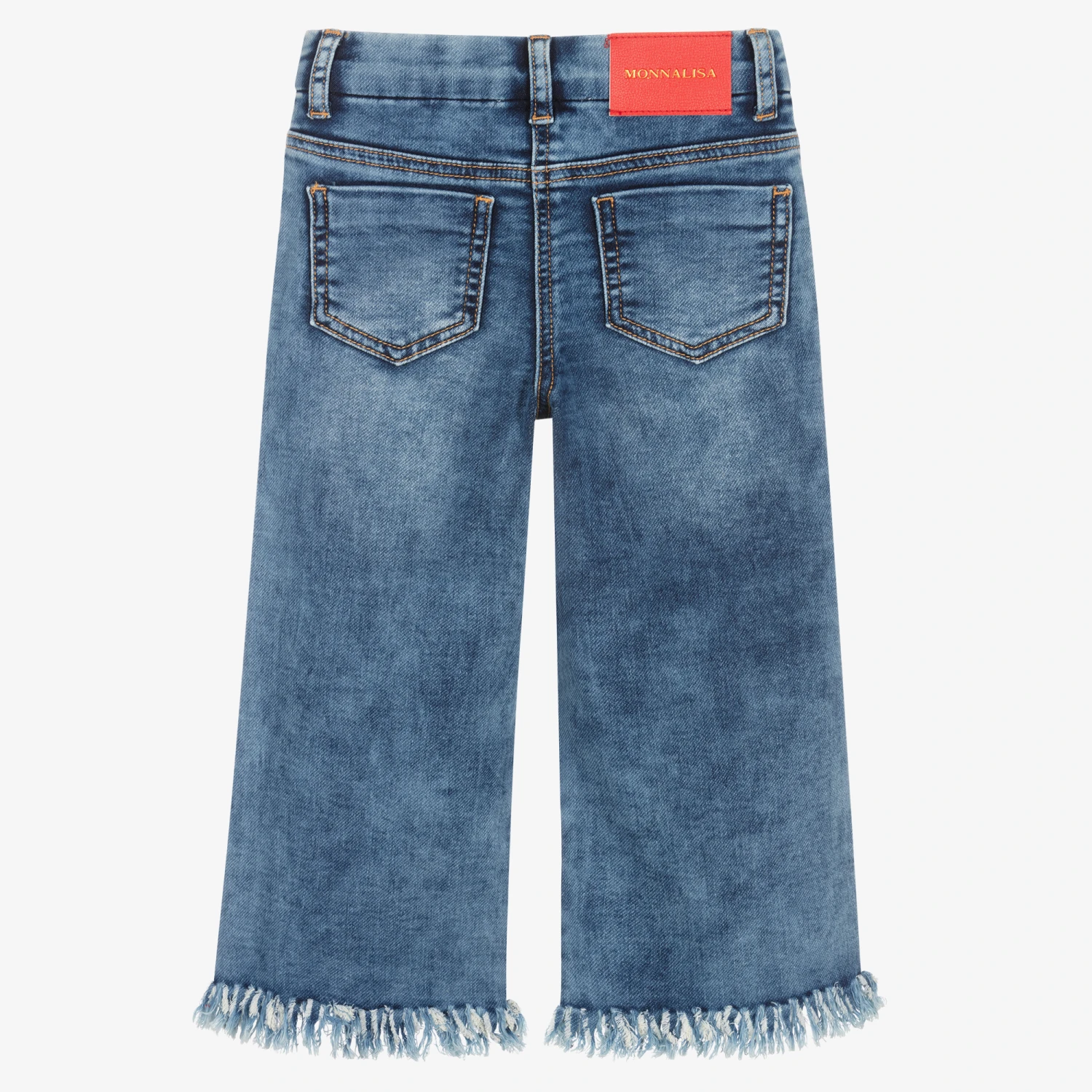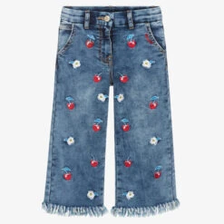 Eye-catching blue jeans for girls by Italian designer Monnalisa, cropped in style with frayed cuffs. They are embellished with beautiful white floral and red cherry embroidery, one of which sparkles with red and blue diamantés. Made in washed and worn-look cotton denim with five pockets, they are slightly stretchy with an adjustable waist for comfort and fit. There is a bright red logo badge around the back.