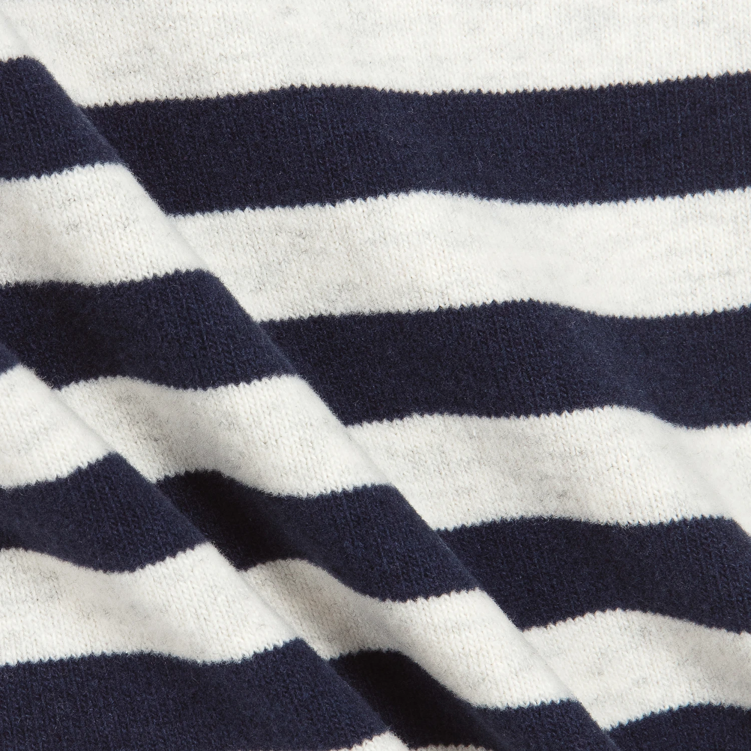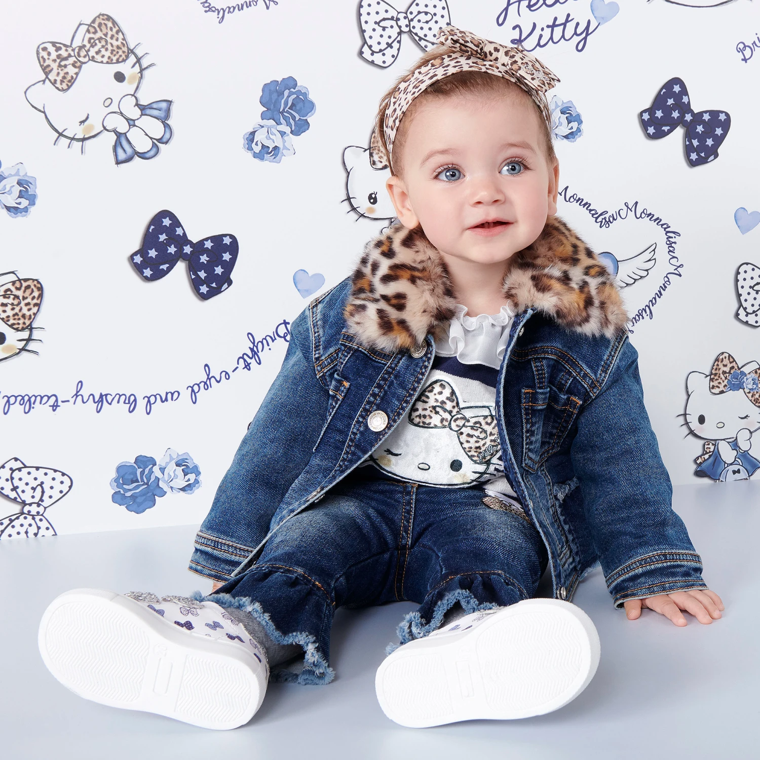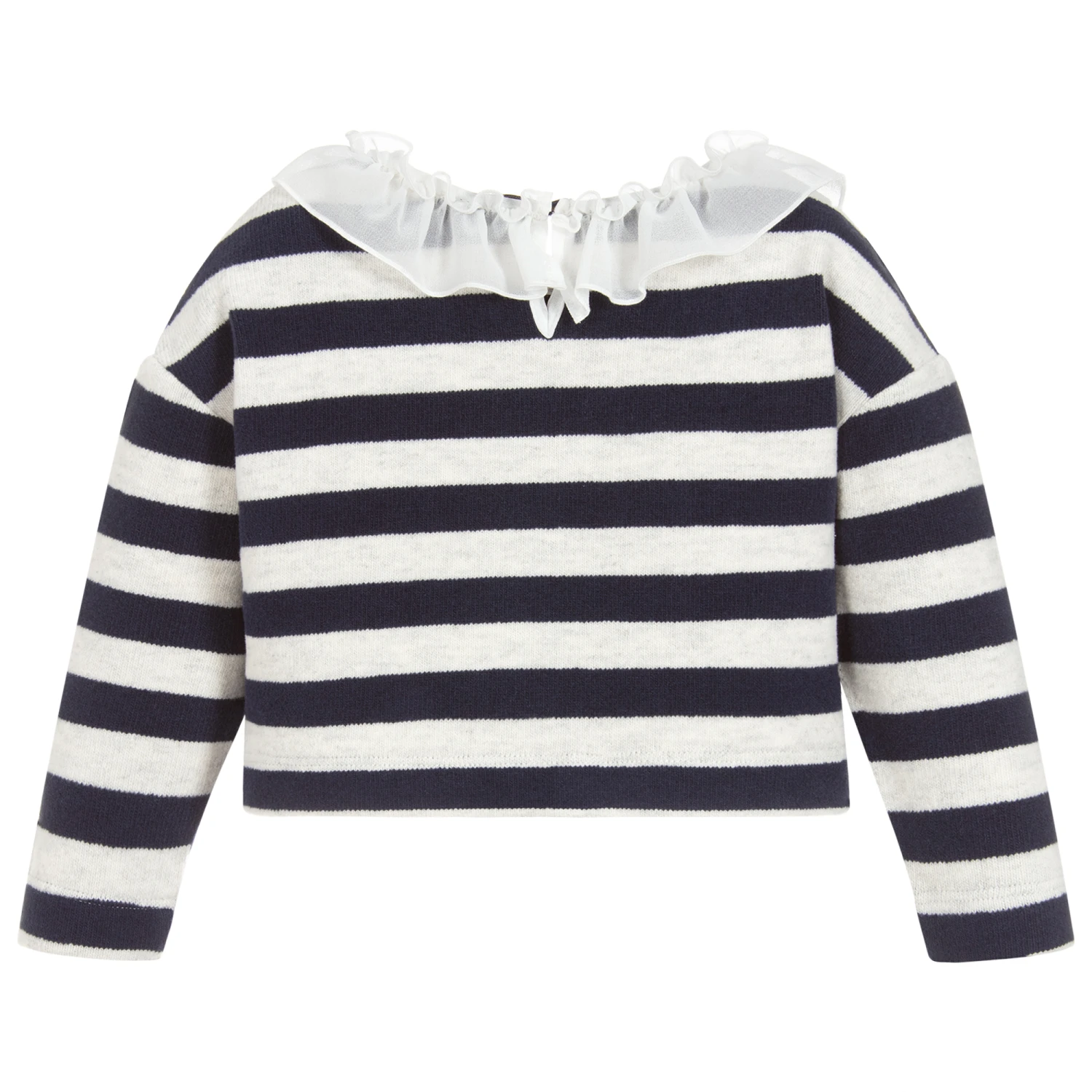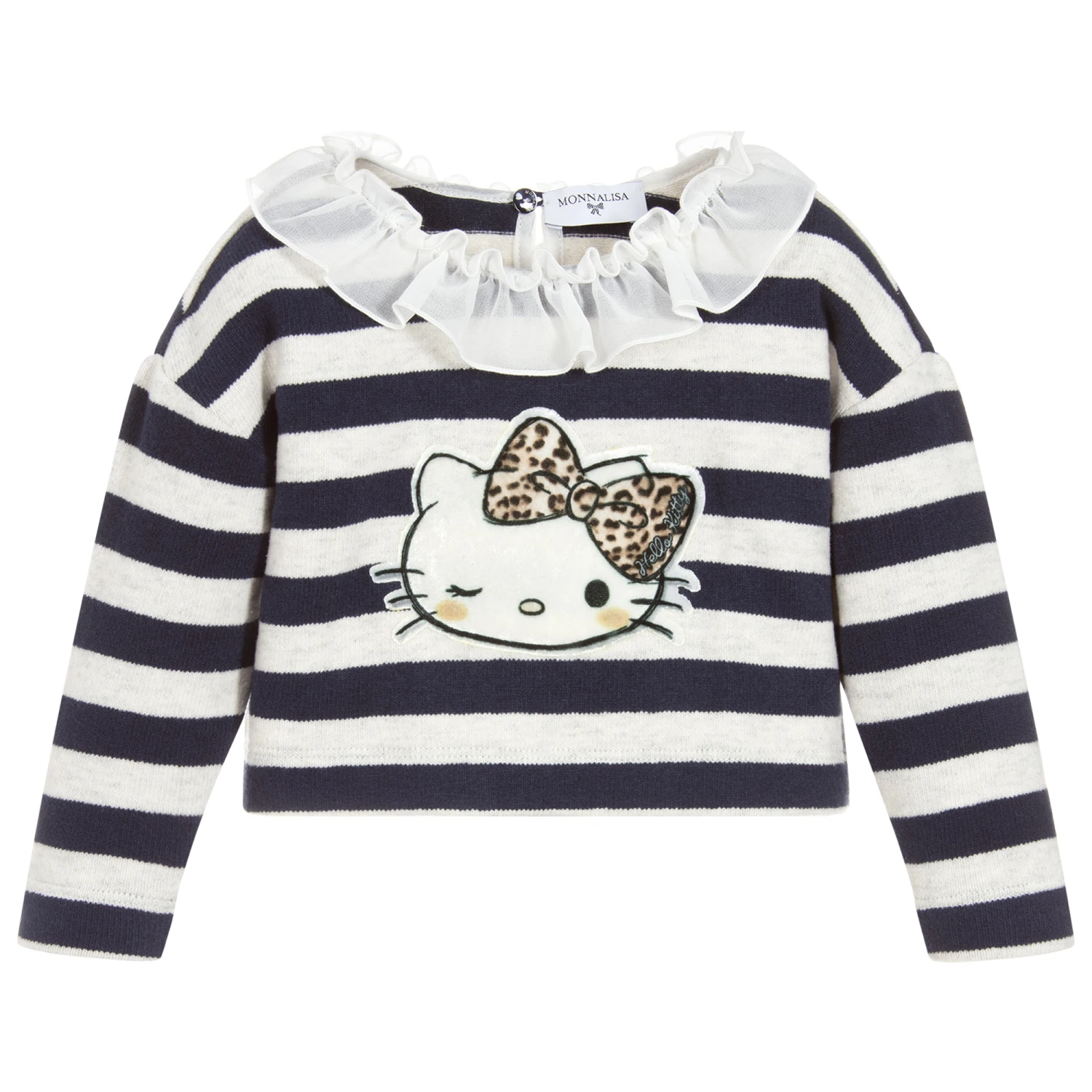 Younger girls navy blue and ivory grey marl striped sweater from Monnalisa, knitted in a super soft cotton blend. It has a velvet Hello Kitty patch on the front and a chiffon ruffle collar.
