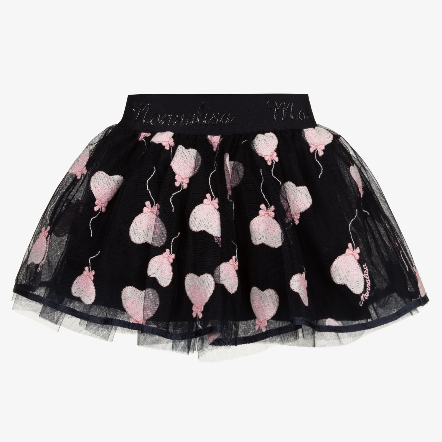 Navy blue tulle skirt for little girls by Monnalisa, patterned with lovely pink embroidered balloons. It has a soft, lightweight lining, with tulle layers for added volume. The waistband is elasticated, with rubberised logos.