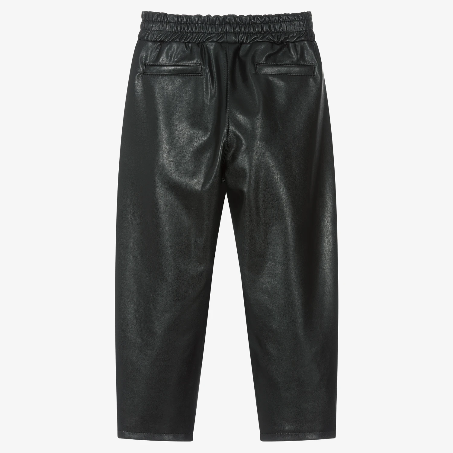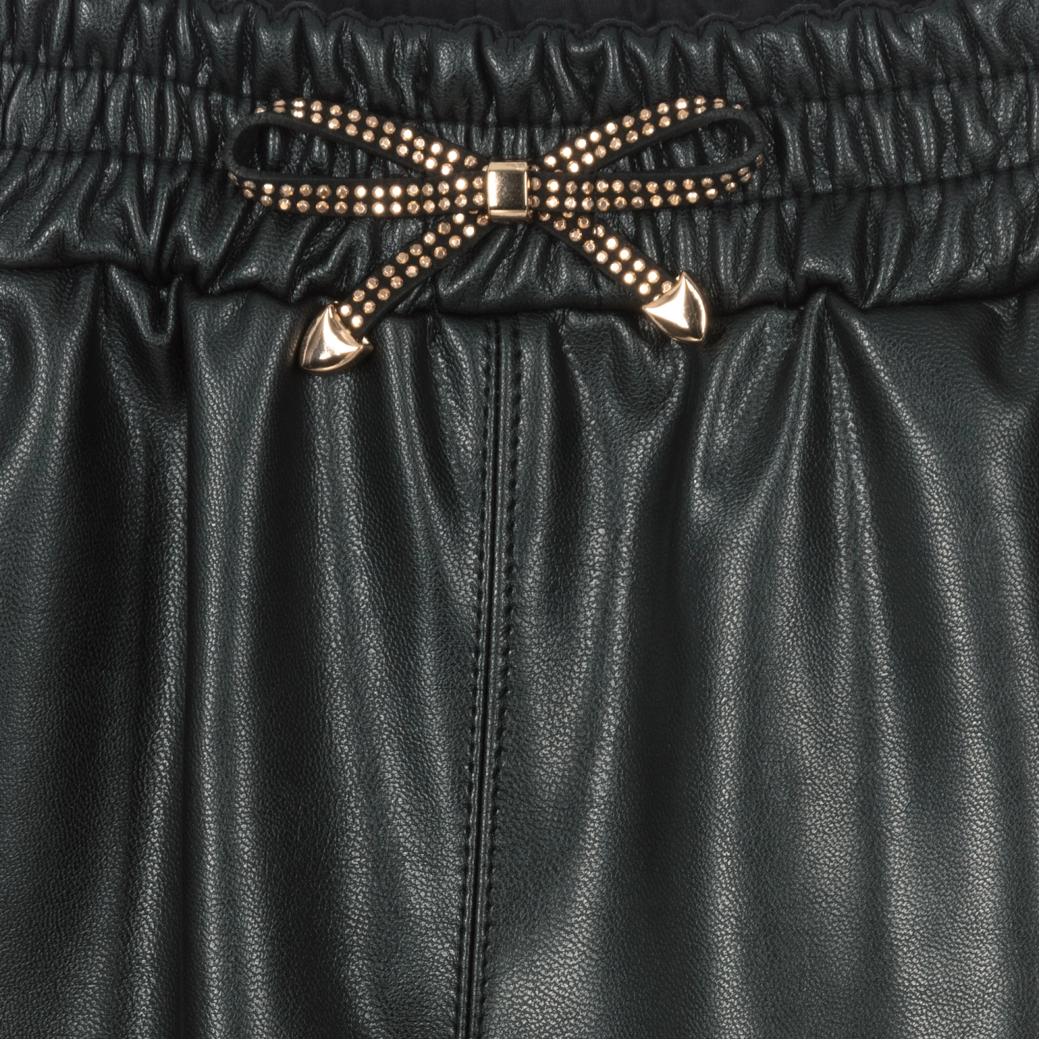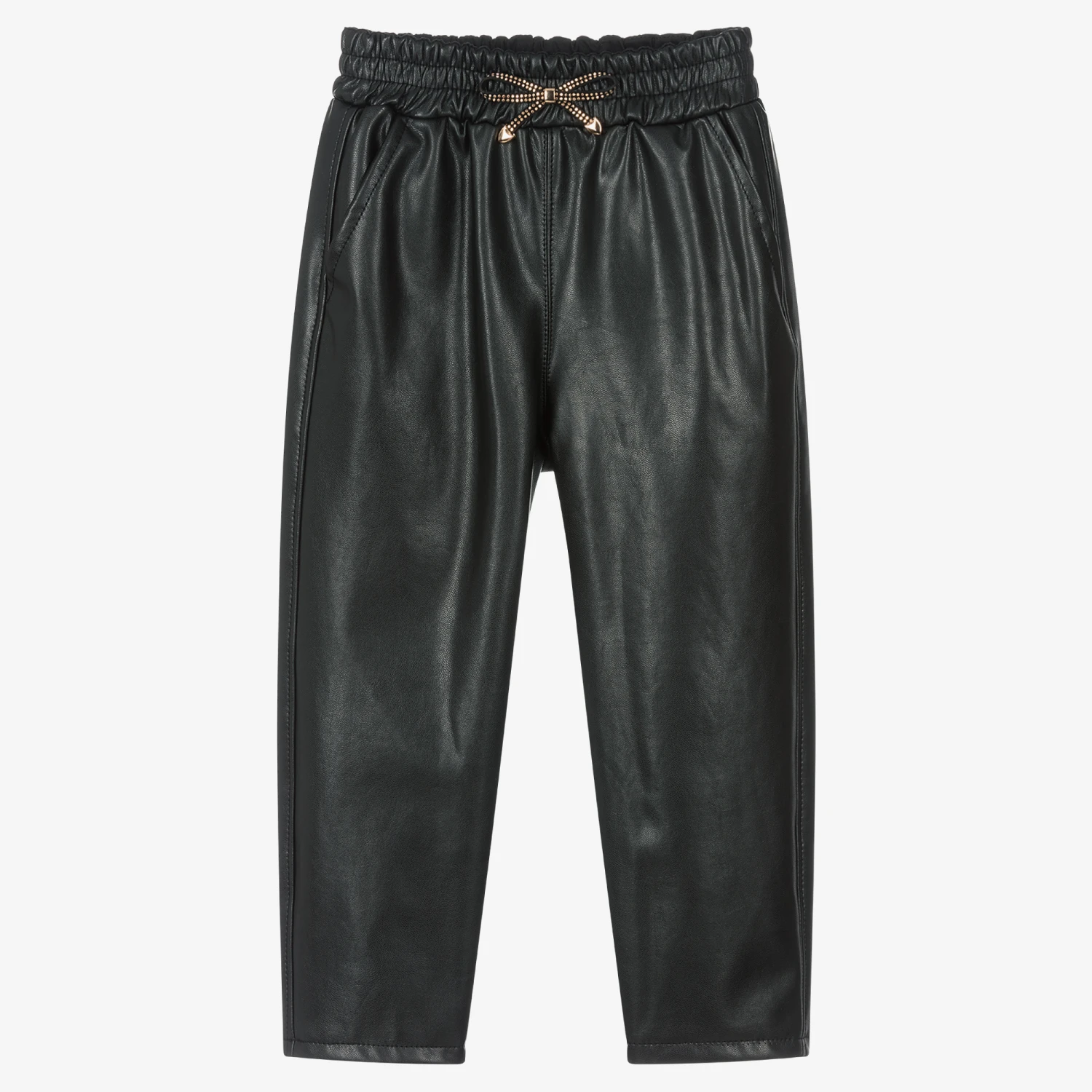 Gorgeous black faux leather trousers for girls by Italian designer Monnalisa. Smooth and supple, they have an eye-catching gold-studded bow on the comfortable, elasticated waistband. They are loose-fitting and taper towards the ankle. They have jetted front pockets and faux back pockets.