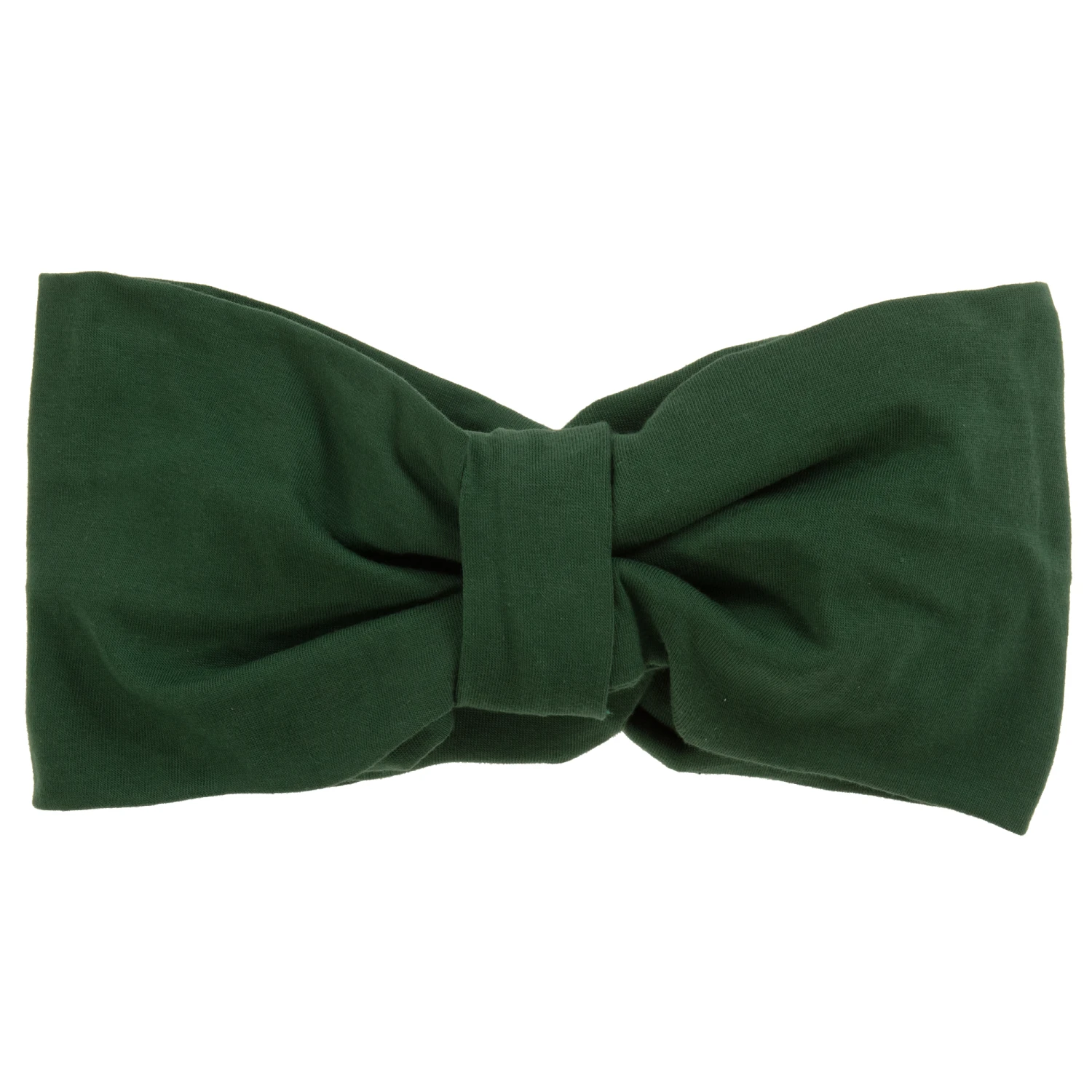 Girls green stretch cotton jersey headband from Monnalisa. In the style of a turban, with a sparkly diamanté logo and the back is elasticated.