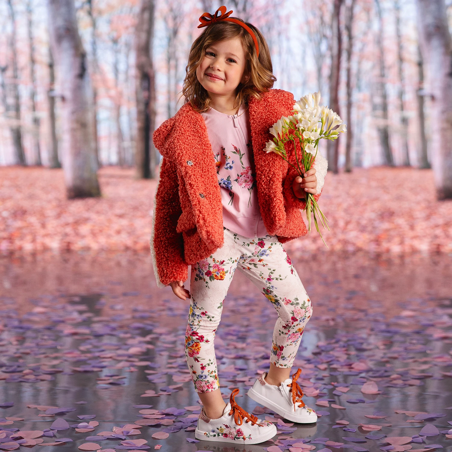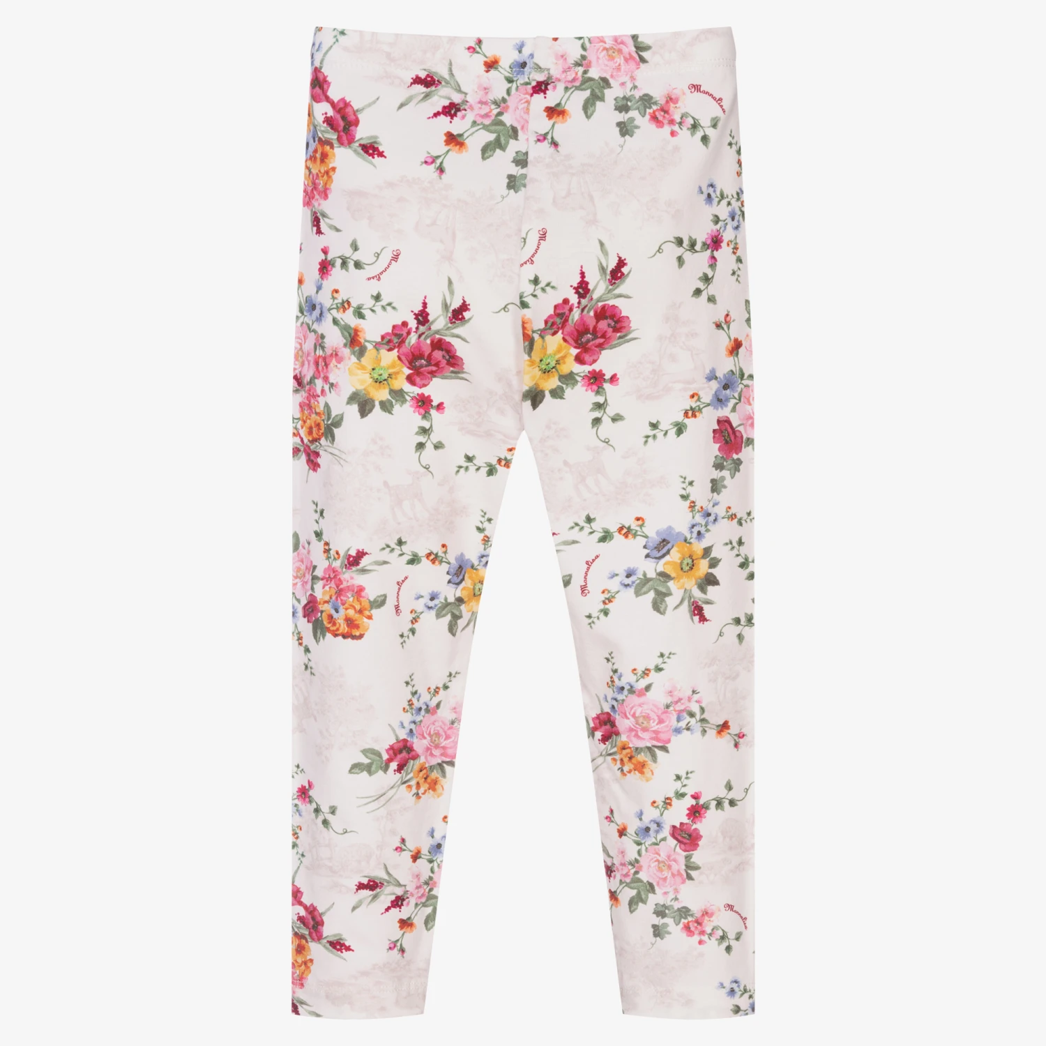 Pretty ivory cotton leggings for girls by Italian brand Monnalisa. Full length, they have a colourful print of flowers, beige Toile de Jouy pastoral scenes and red logos. Endlessly comfortable, they are made in jersey and have an elasticated waistband.