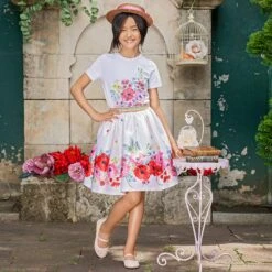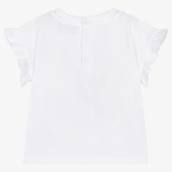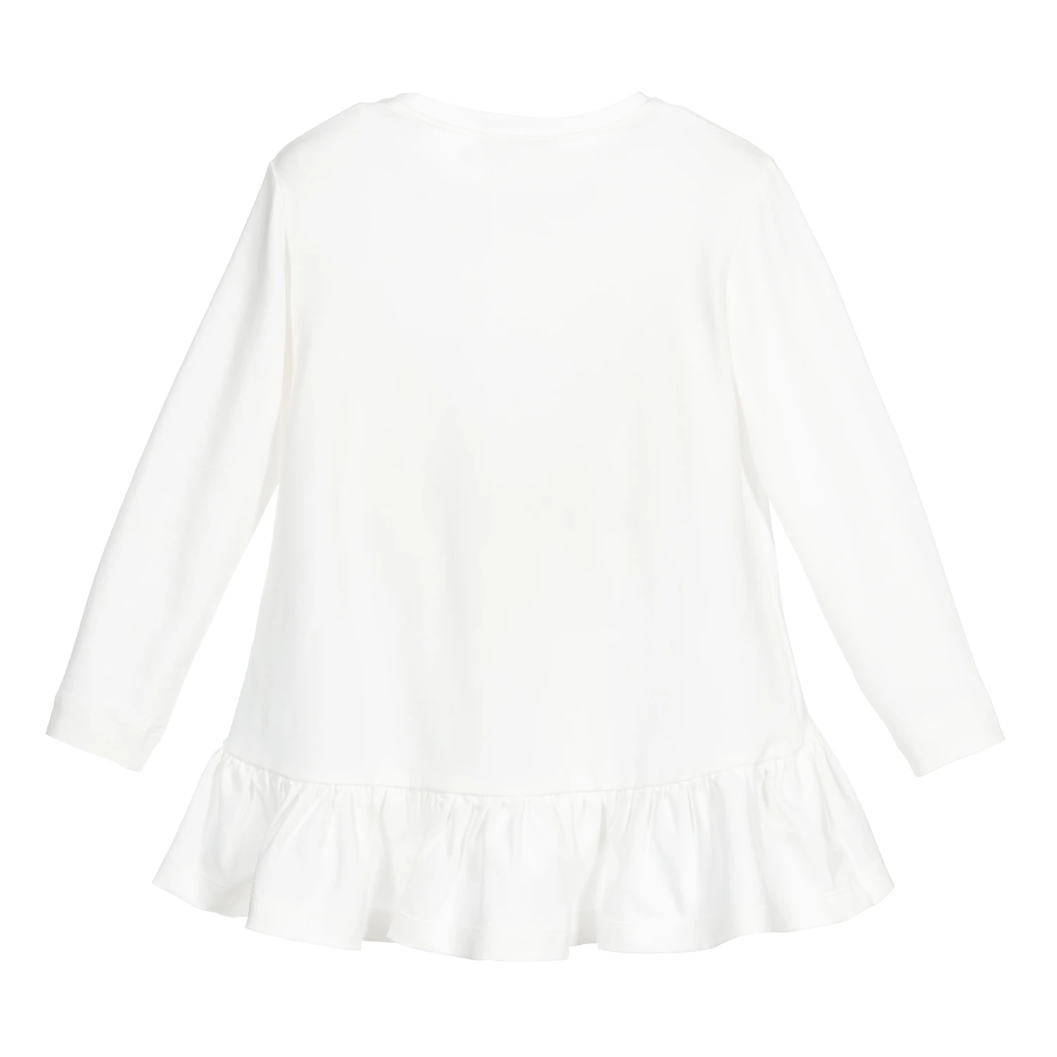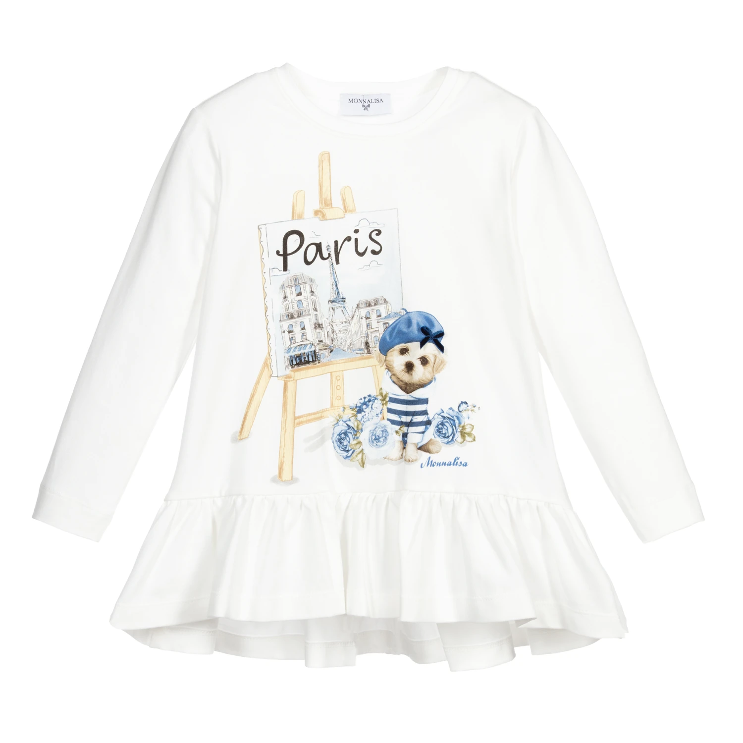 Ivory tunic for girls by Monnalisa, made in soft and stretchy cotton jersey. There is a blue and brown Paris dog print on the front with a blue logo and blue velvet bow. The ruffled hem is slightly longer at the back than the front.