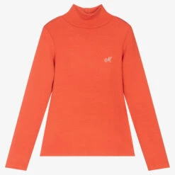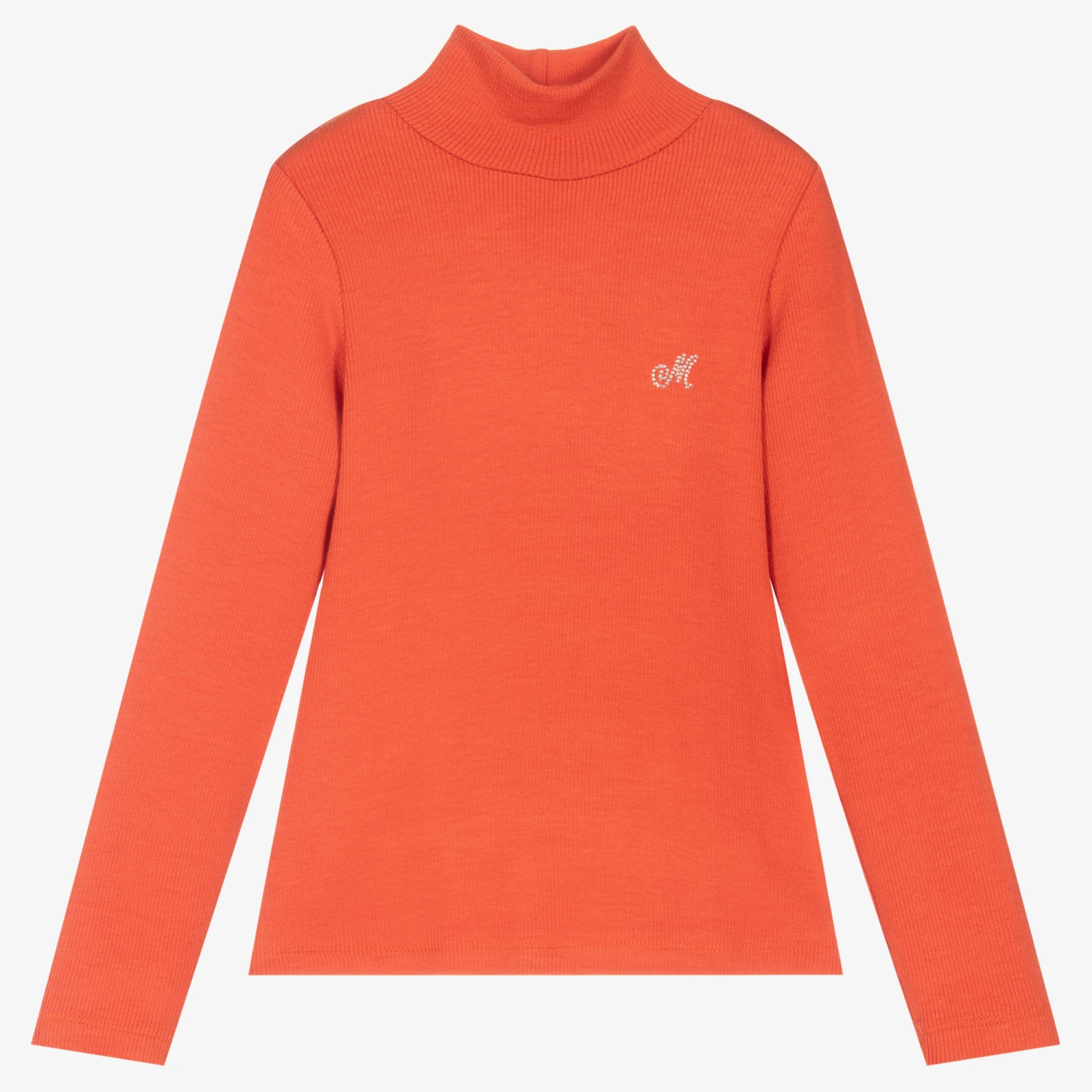 Orange turtleneck sweater for girls by Italian brand Monnalisa, sparkling with a diamanté logo on one side. Super soft and comfortable, it is made in ribbed viscose and is ideal to be worn alone or as a layering piece.