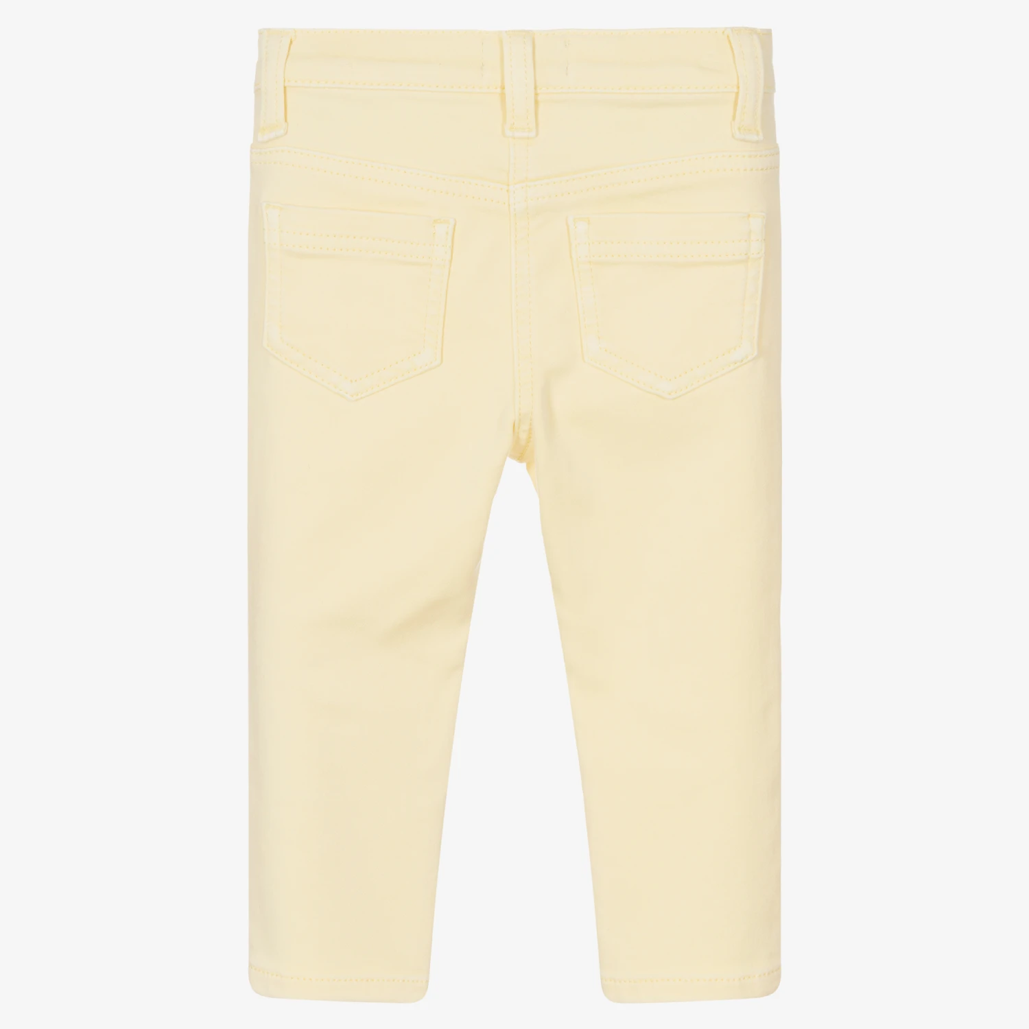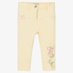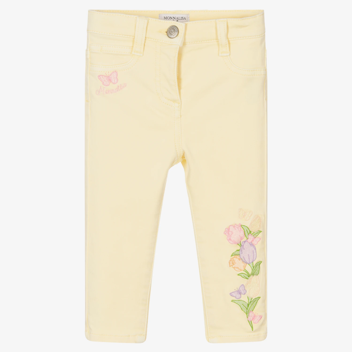 Pale yellow skinny jeans for little girls by Monnalisa, with a handy adjustable waist to allow room to grow. Ideal for adding a touch of summery colour to any outfit, they have a pink butterfly embroidered by the front pocket and colourful tulips down one leg. Made in soft stretch denim, they fasten easily with a single logo button.